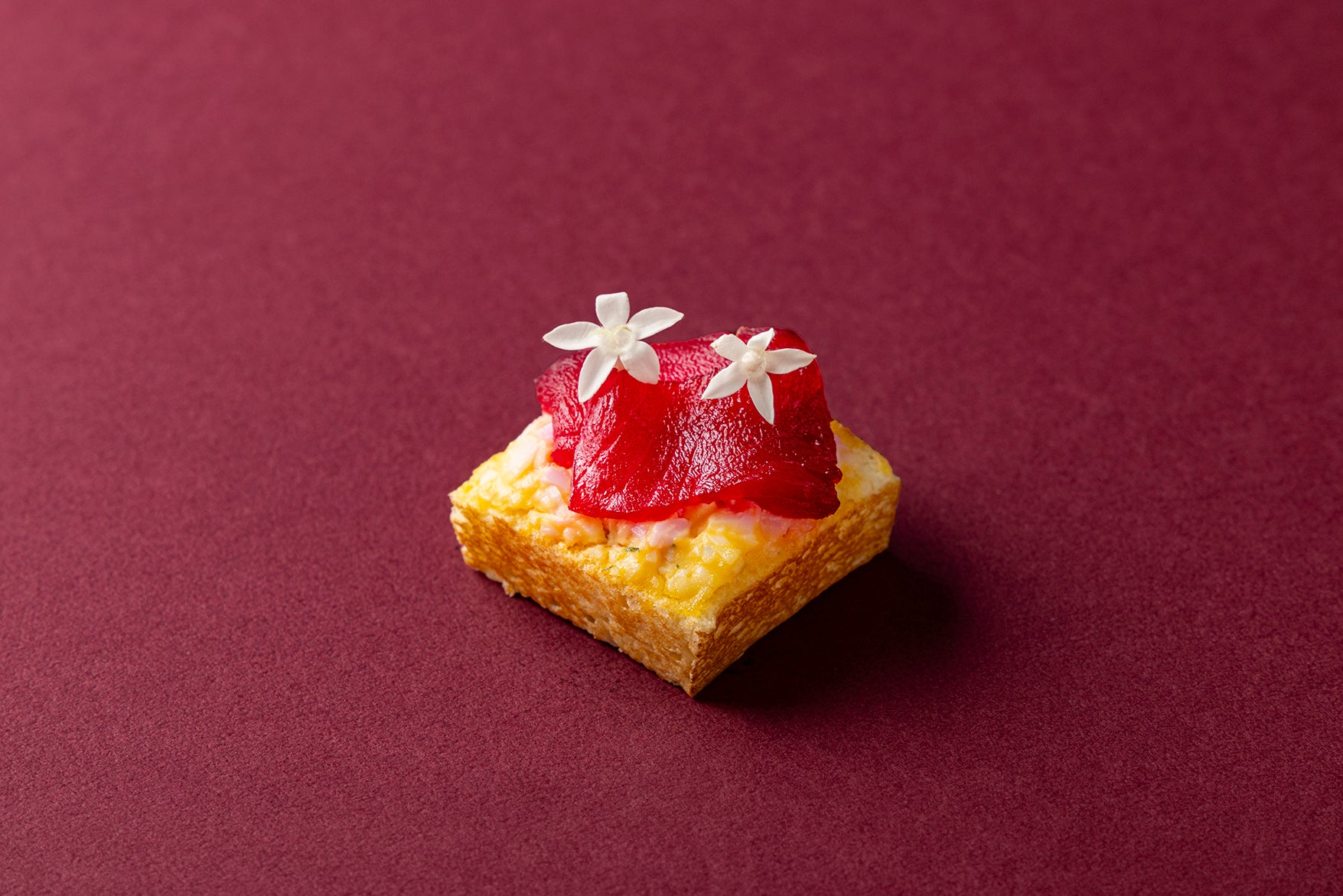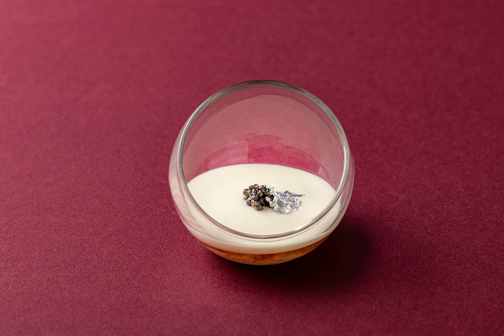 蟹のタルタルに、ビーフコンソメのゼリーと根セロリのクリームソースを重ねて、キャビアと銀箔をトッピング。蟹とコンソメの豊かな風味に、根セロリの爽やかなアクセントが効いた奥行きのある味わいに。