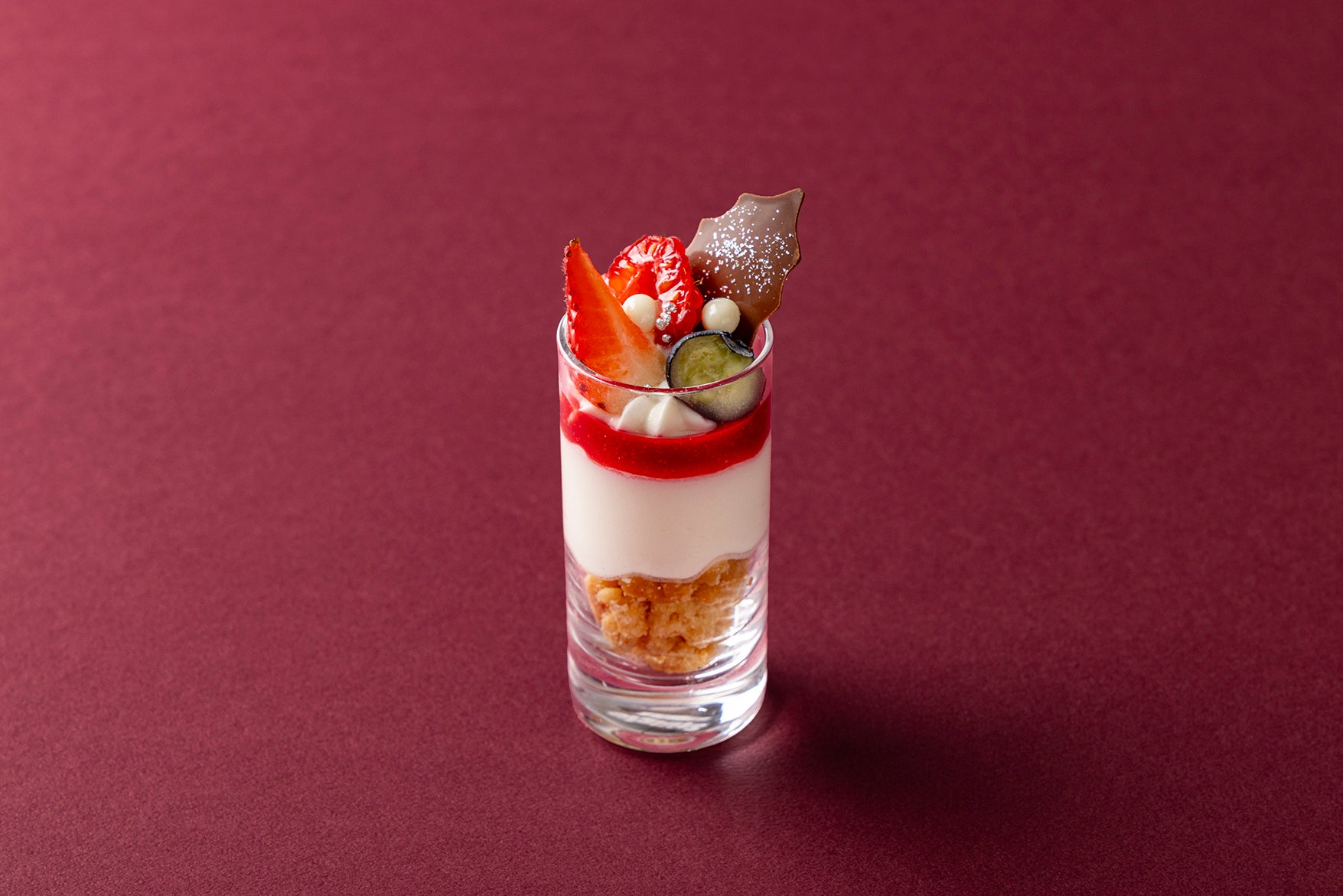 ザクザクした食感のクッキー生地に、ほんのり酸味を効かせたフロマージュブランと甘酸っぱいラズベリーソースを重ねたことで、味わいの濃淡や食感の変化をお楽しみいただけます。色鮮やかなフレッシュベリーとひいらぎを模ったミルクチョコレートを飾り、クリスマスの装いに。