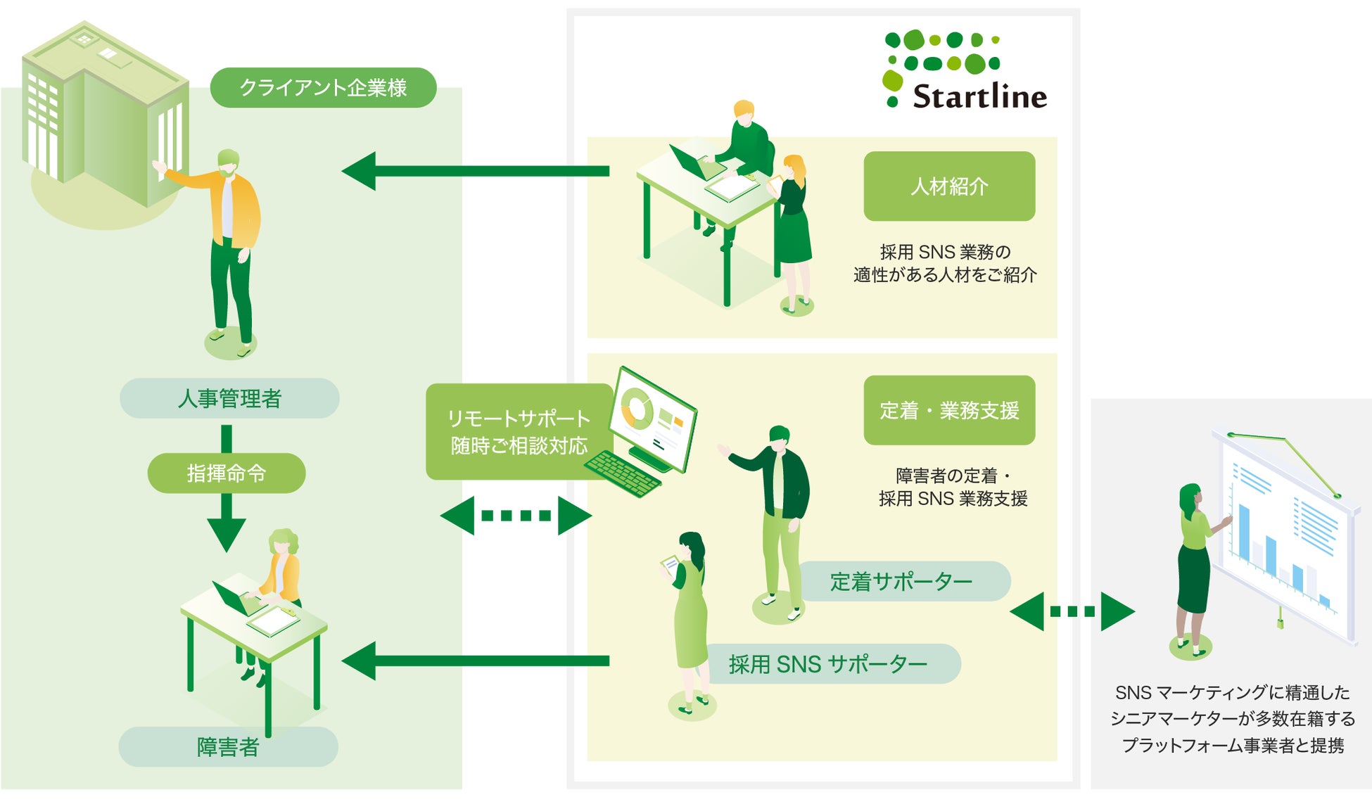 また、就労後の障害者の定着サポートに関しては、スタートラインが独自に開発したオンラインサポートシステム「Enable360(読み:イネイブルサンロクマル)」と、スタートラインのサポートスタッフによるオンライン相談や面談を活用し、障害者の安定した就労を目指します。