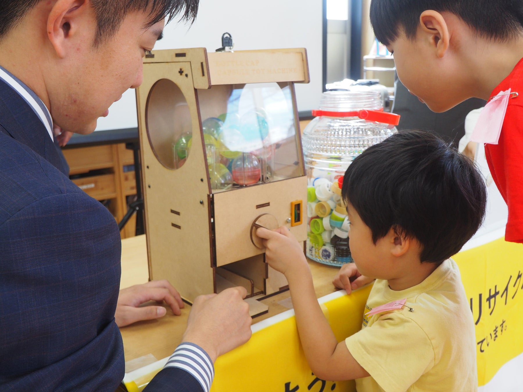 また、園児たちが家庭などから集めたペットボトルキャップを活用し、硬貨の代わりにキャップを入れて遊べるカプセルトイ「循環ガチャ Model-S」をご用意いただきました。カプセルトイの中身として、ペットボトルキャップをアップサイクルしてつくられたマグネットやビニール製バッグが園児たちに贈られました。自分たちが集めたキャップがリサイクルされ、価値あるものに生まれ変わる過程を、園児たちが実際に目で見て体験できる貴重な機会となりました。