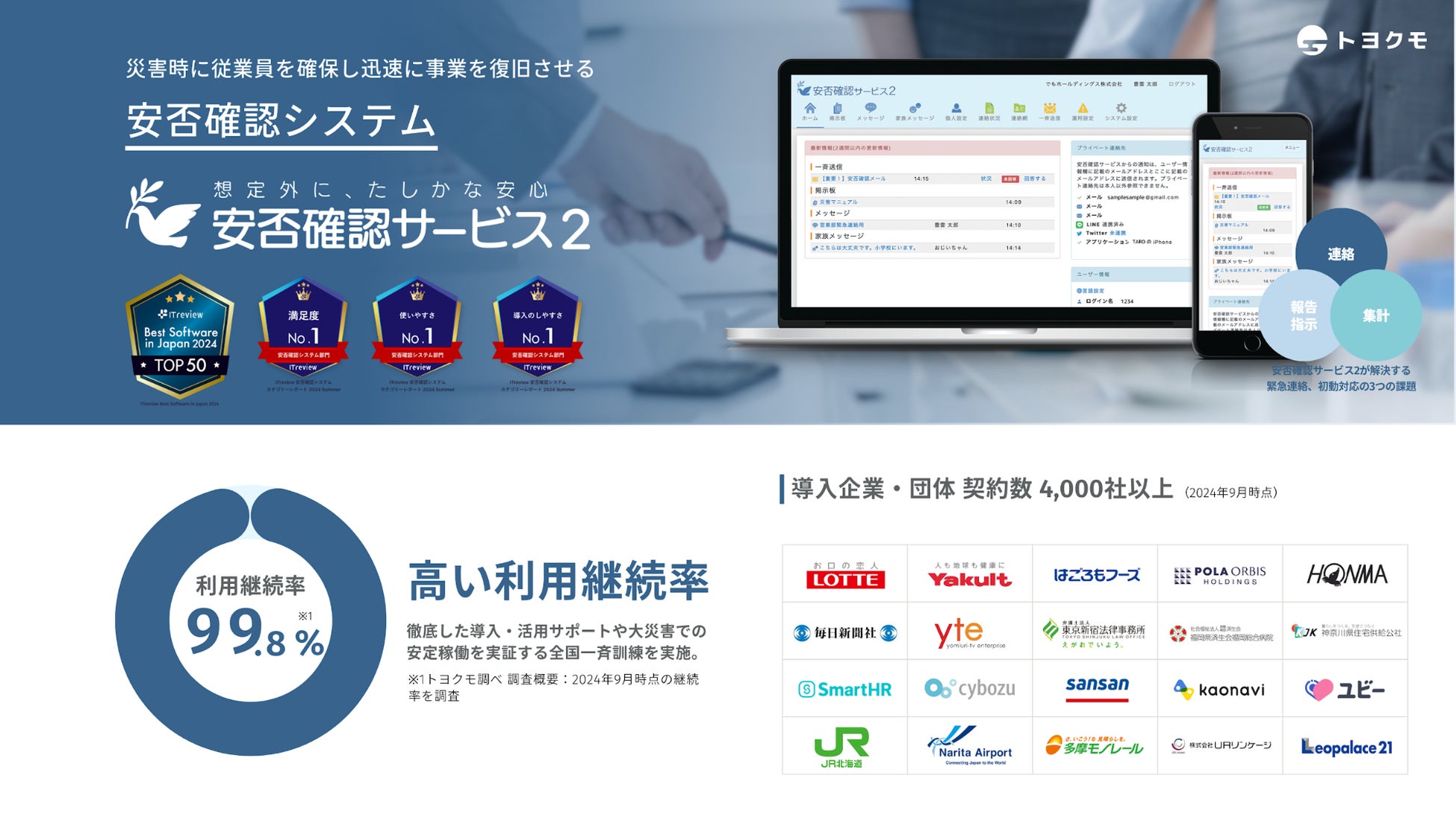安否確認サービス2は、4,000社以上(2024年9月時点)が利用する法人向けの安否確認システムです。