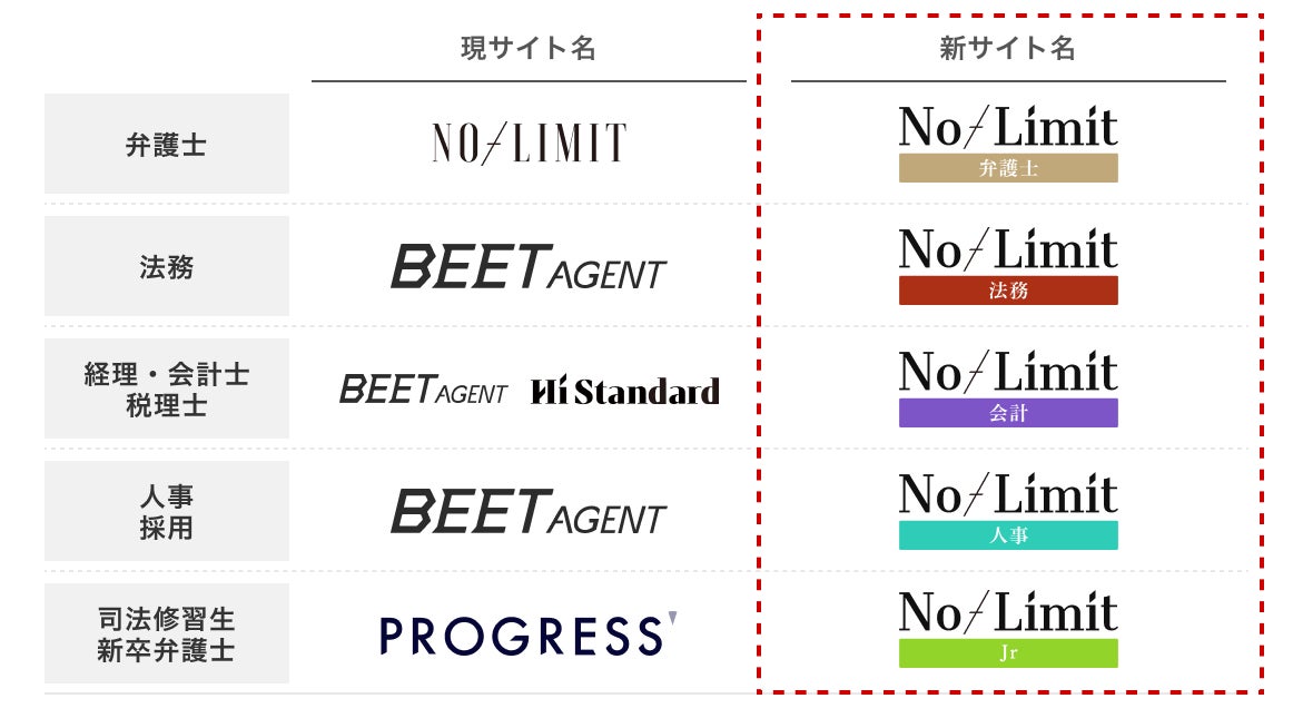 今後は「NO-LIMIT」の「No-Limit 弁護士」へのリニューアルを第一歩として、公認会計士や税理士向けの転職支援サービス「Hi-Standard」、人事・総務・経理担当といったバックオフィス人材向けの転職支援サービス「BEET-AGENT」などの各種サービスにおいて、順次リニューアルを進めてまいります。