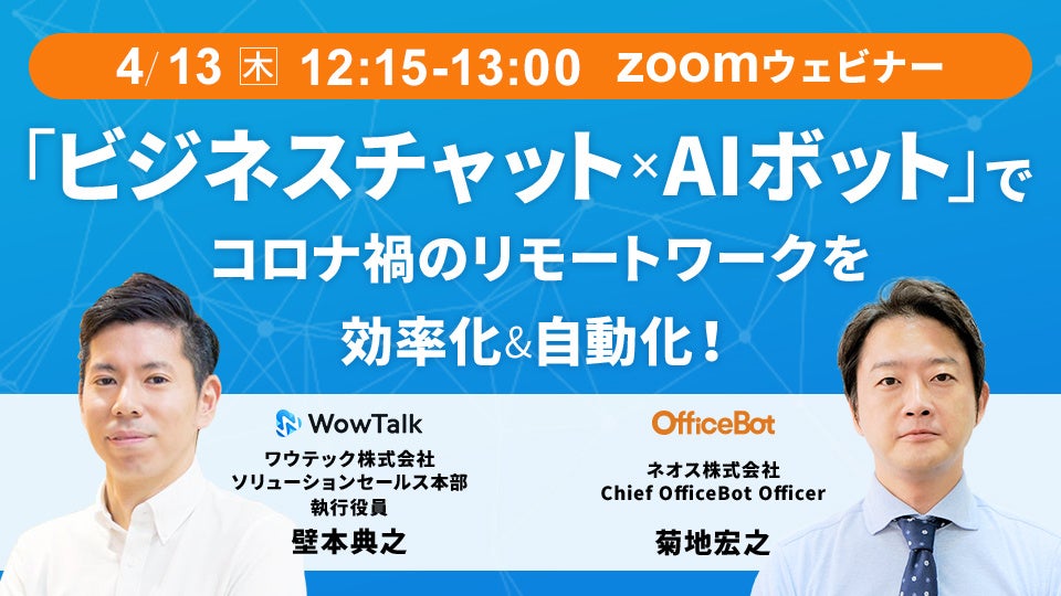 利用社数10,000社超と多くのビジネスパーソンにご利用いただいているサービス、ビジネスチャット・社内SNS「WowTalk(ワウトーク)」を開発・提供するワウテック株式会社(本社:東京都港区、代表取締役社長:瀬沼 悠)は、『WowBotで始めるナレッジマネジメント』をテーマとしたネオス株式会社(本社:東京都千代田区、代表取締役社長:池田 昌史)との共催ウェビナーを、2023年4月13日〜5月25日の期間にて、隔週で定期開催することをお知らせします。