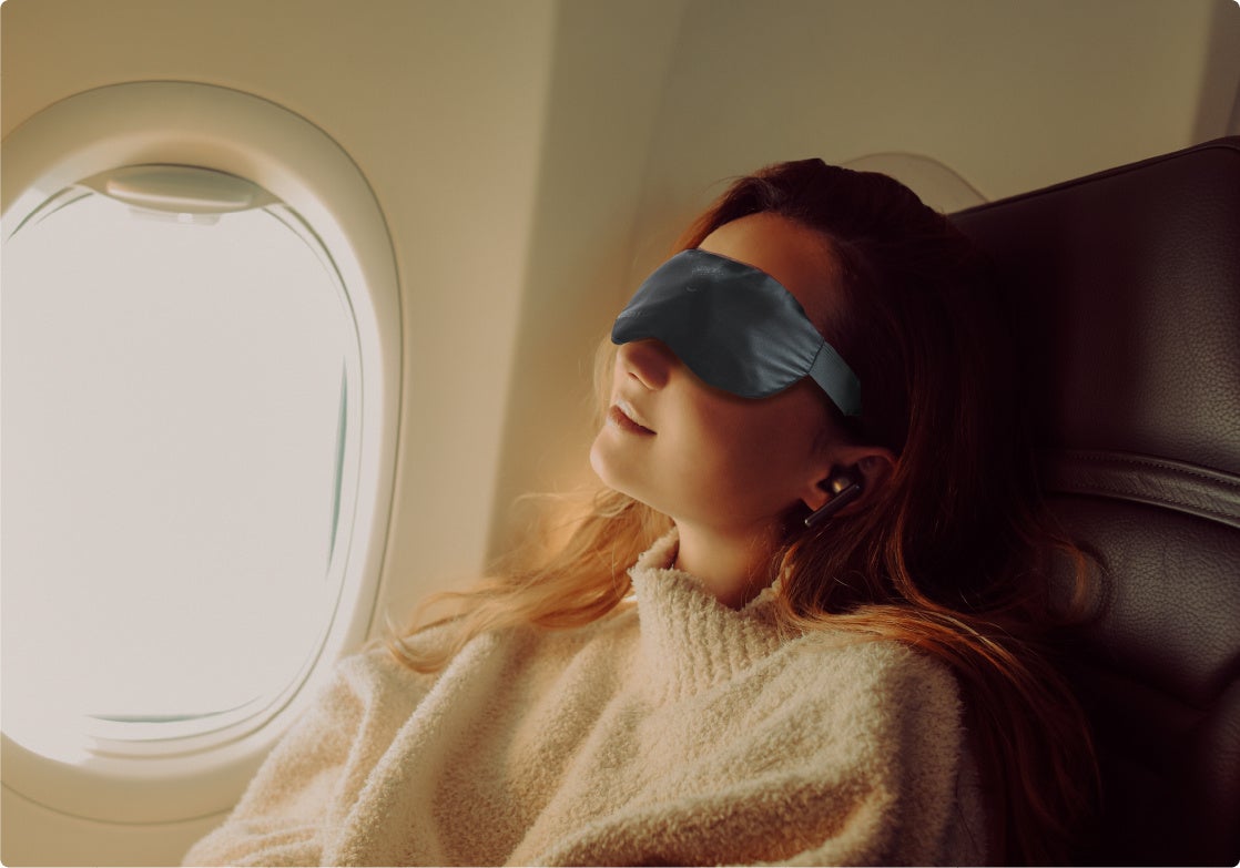充電式コードレス仕様のための軽量バッテリーと操作ボタンがフェイスラインに当たりづらく、寝返りしても邪魔にならないように、それらを中央に配置しました。ゴムバンドの長さを調整すると顔にもぴったりフィットします。座った状態で使用してもずれる心配がありません。サイズはフリーサイズです。
