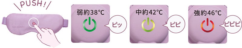 目もとから広がる温かさは3段階。弱約38℃、中約42℃、強約46℃から選べます。設定時に音でお知らせし、本製品を装着したままで調整できます。