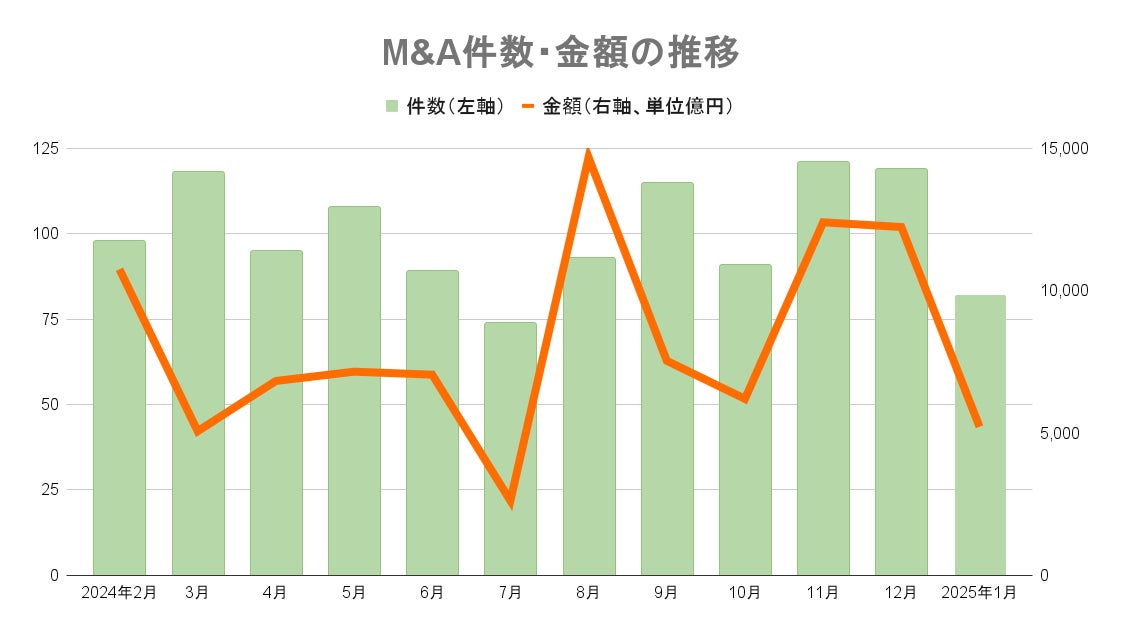 2025年1月のM&A件数(適時開示ベース)は82件となり、前年同月比で17件減少しました。取引総額も5221億円と前年同月の約半分に留まり、出足は低調でした。
