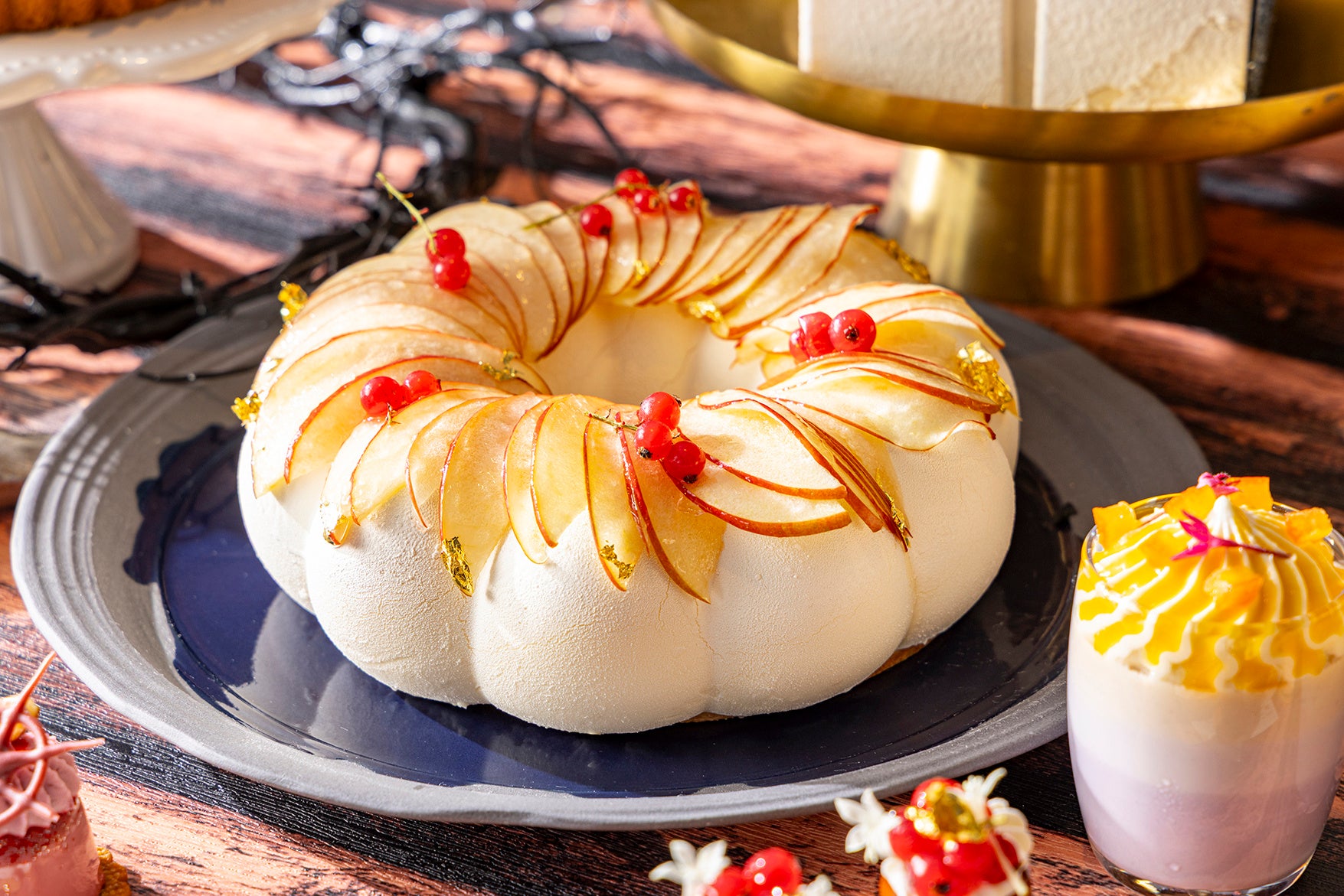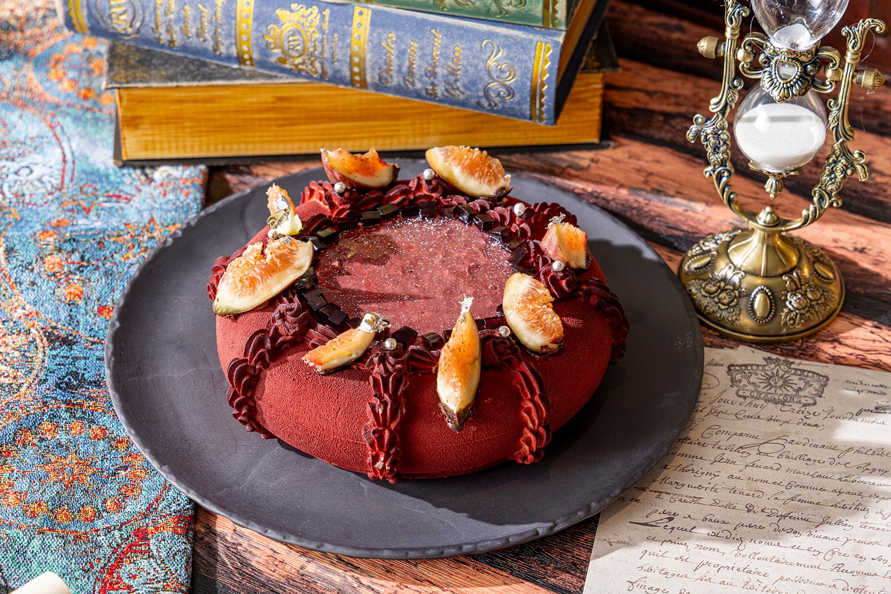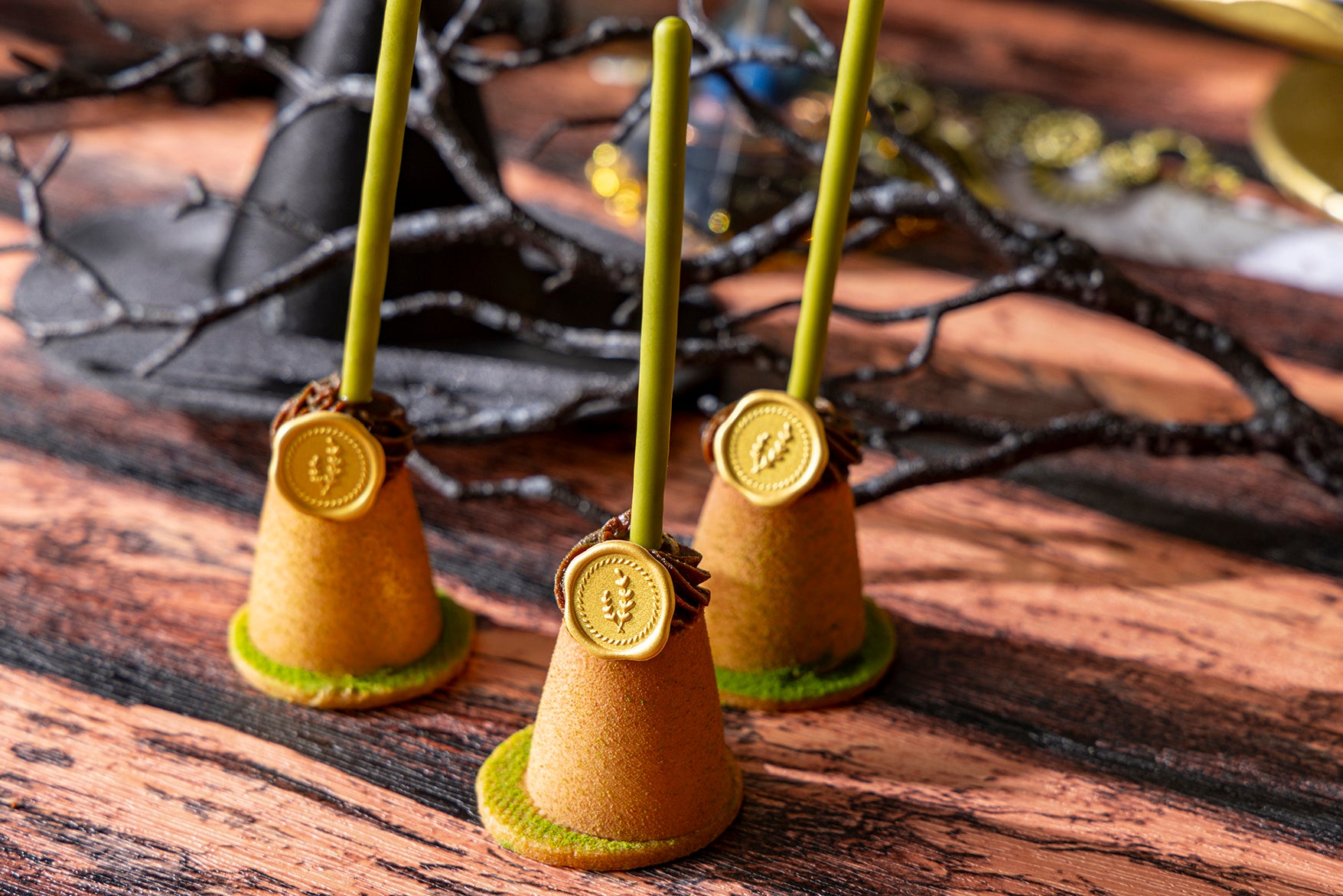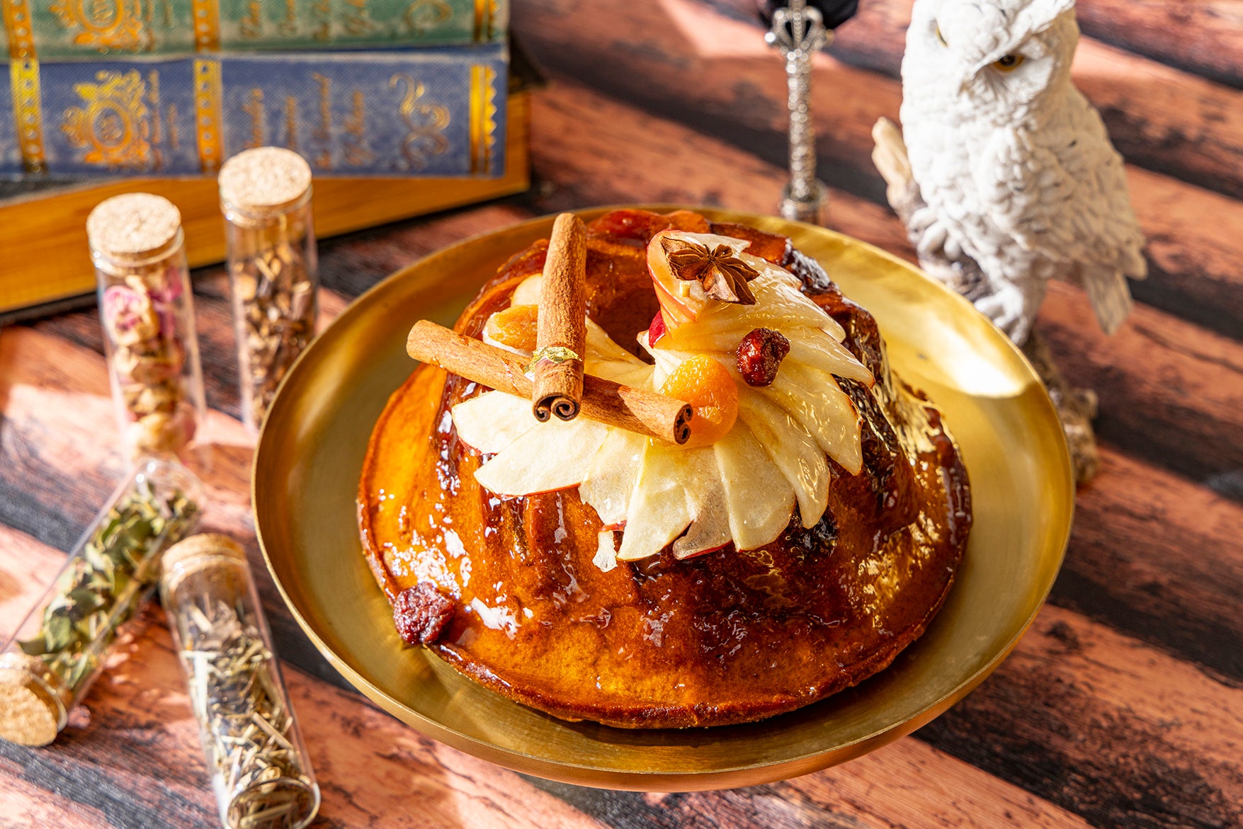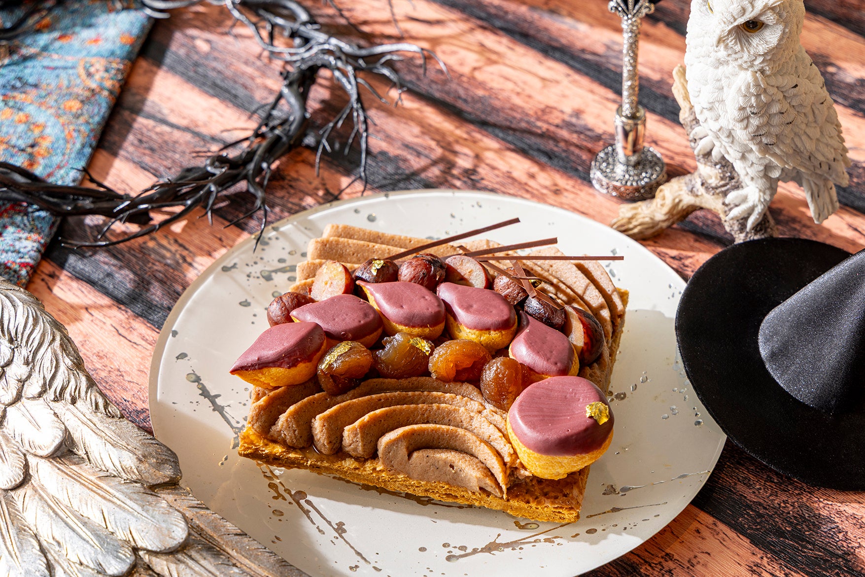 ブランディベースのマロンリキュールをほんのり効かせたマロンクリームにマロングラッセをトッピングしたキャラメルチョコレートタルト「ウィザードのマロン集会」は香りとコクが重なり合う秋の余韻を感じさせる贅沢な一品です。レモンゼストや柚子など、様々な柑橘で仕立てたシロップを纏わせたパンドジェーヌにスパイスを重ねた「シトラスで封印された密書」、ザクロムースの中央にタイム香る赤ワインでコンポートした無花果を忍ばせた「オナーズウィッチの証」、ヨーグルトムースの中にキャラメリゼしたリンゴ、さらに芳ばしいマカデミアナッツがアクセントになった「学生寮のマジカルおやつ」など、バラエティ豊かなスイーツが魔法の世界へと誘います。