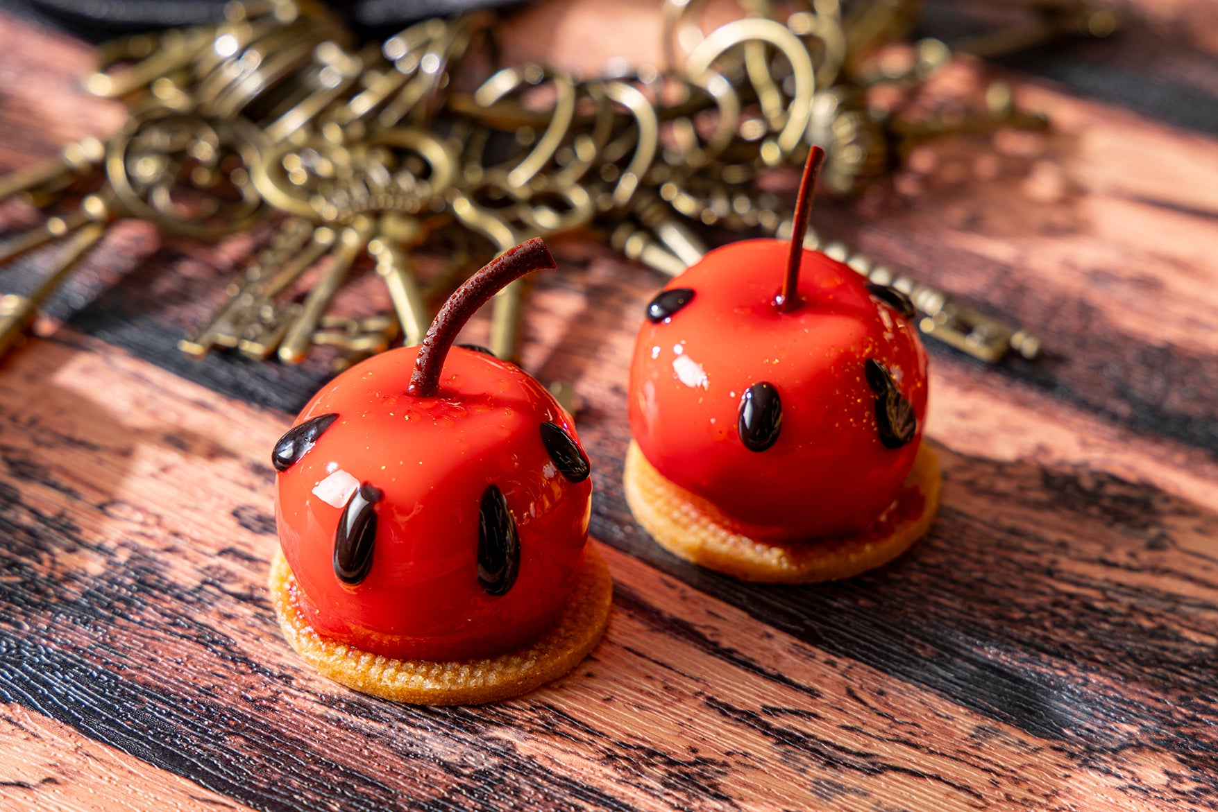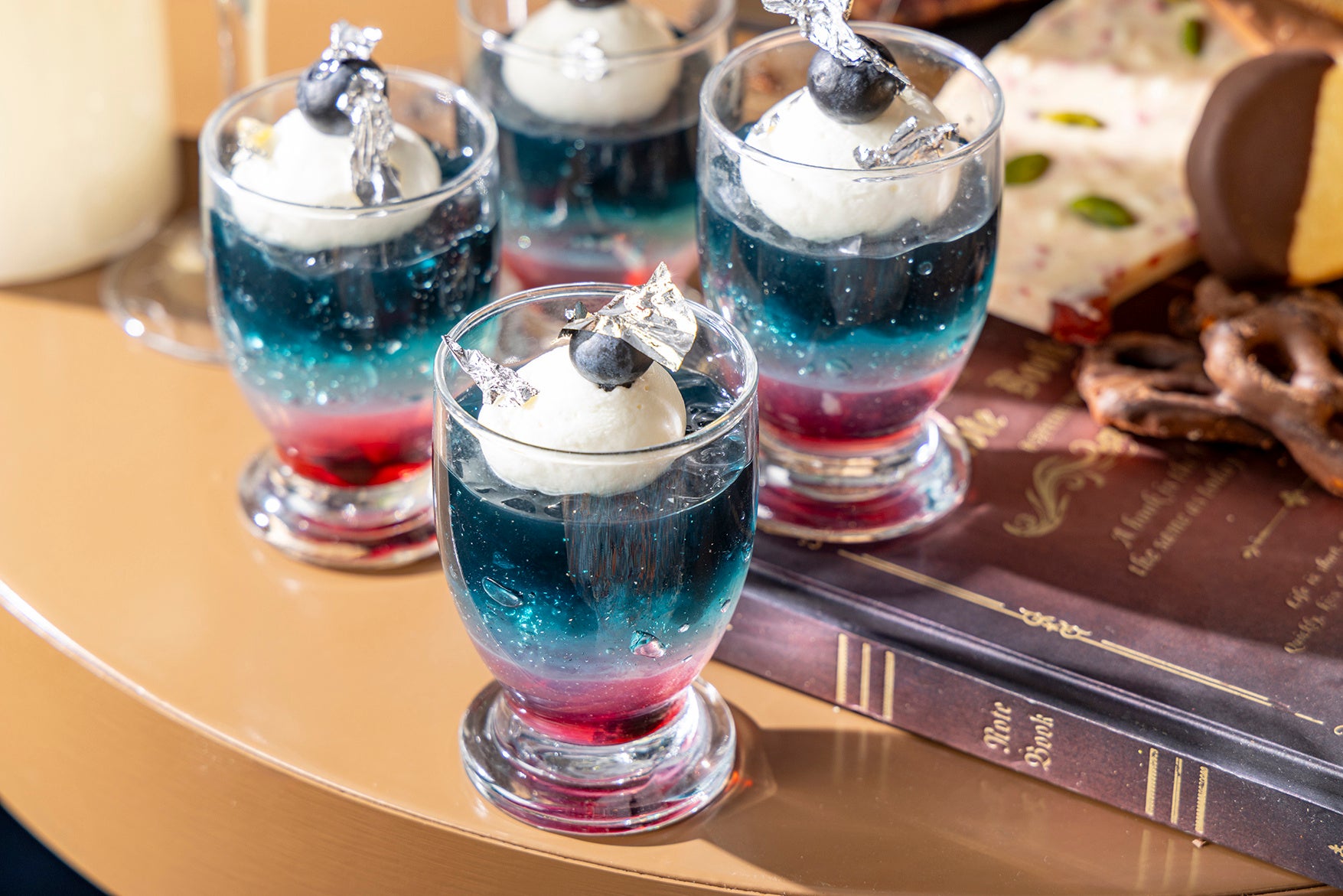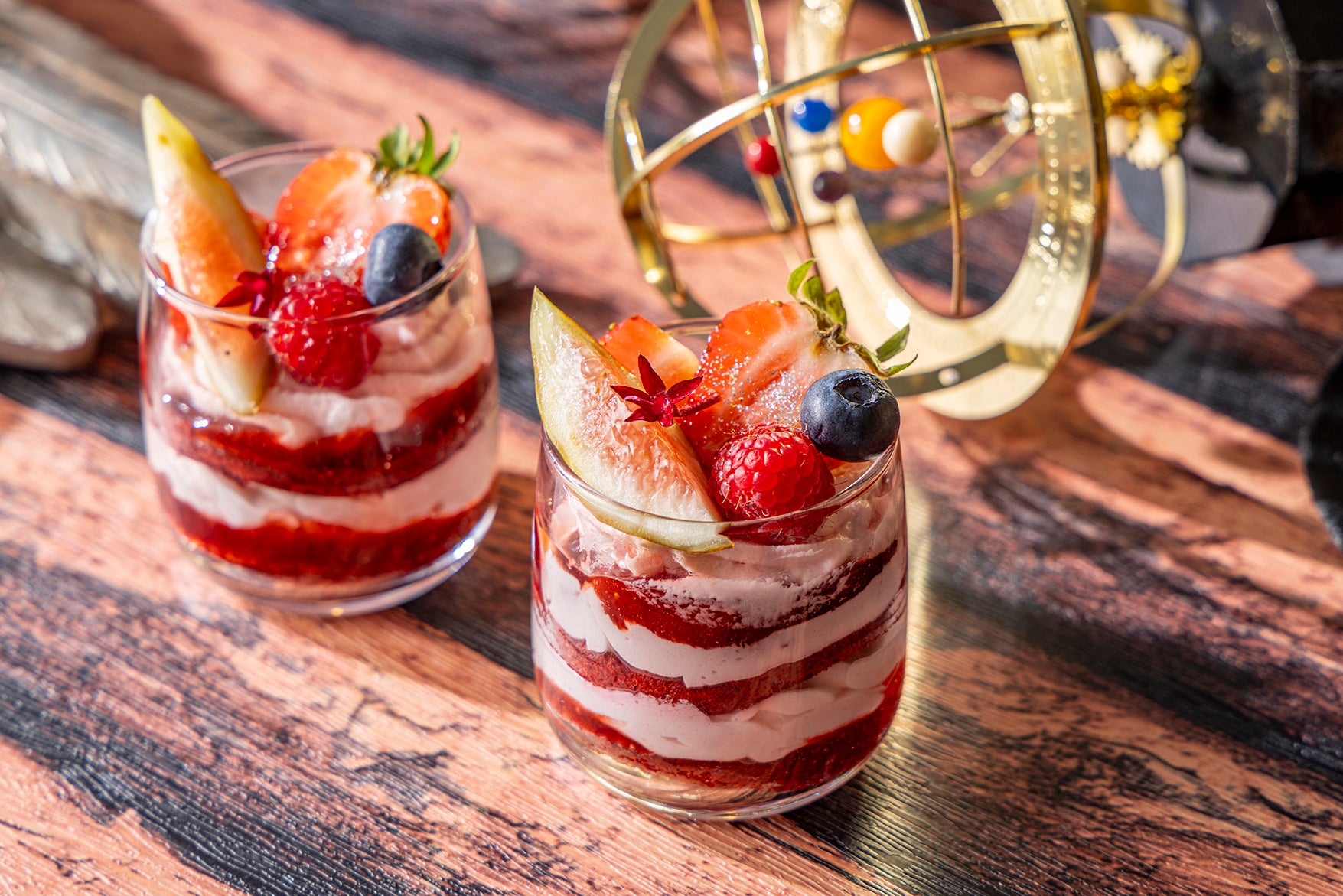 濃厚なヴァローナチョコレートのガナッシュに、トリュフ香るホワイトチョコレートのムースとチョコレートスポンジを重ねたリッチな味わいの「飛行試験前の息抜きスイーツ」は、魔女のほうきをイメージしたユニークなフォルムにも注目です。リンゴの形がキュートな「華麗なるトリック」は、ジンジャーやカルダモン、クローブ、シナモンなどのスパイス香るマサラティームースの中に、ルビーグレープフルーツの酸味を添えたトリッキーな一品。その他にもバタフライピーとブルーキュラソーで作る鮮やかなブルージュレにカシスの酸味を添えた「アルケミストのエターナルジュレ」、レッドベルベッドに、まろやかなマスカルポーネクリームと甘酸っぱいラズベリーを重ねた「魔法学校の入学式の定番パフェ」などのグラススイーツもお楽しみいただけます。