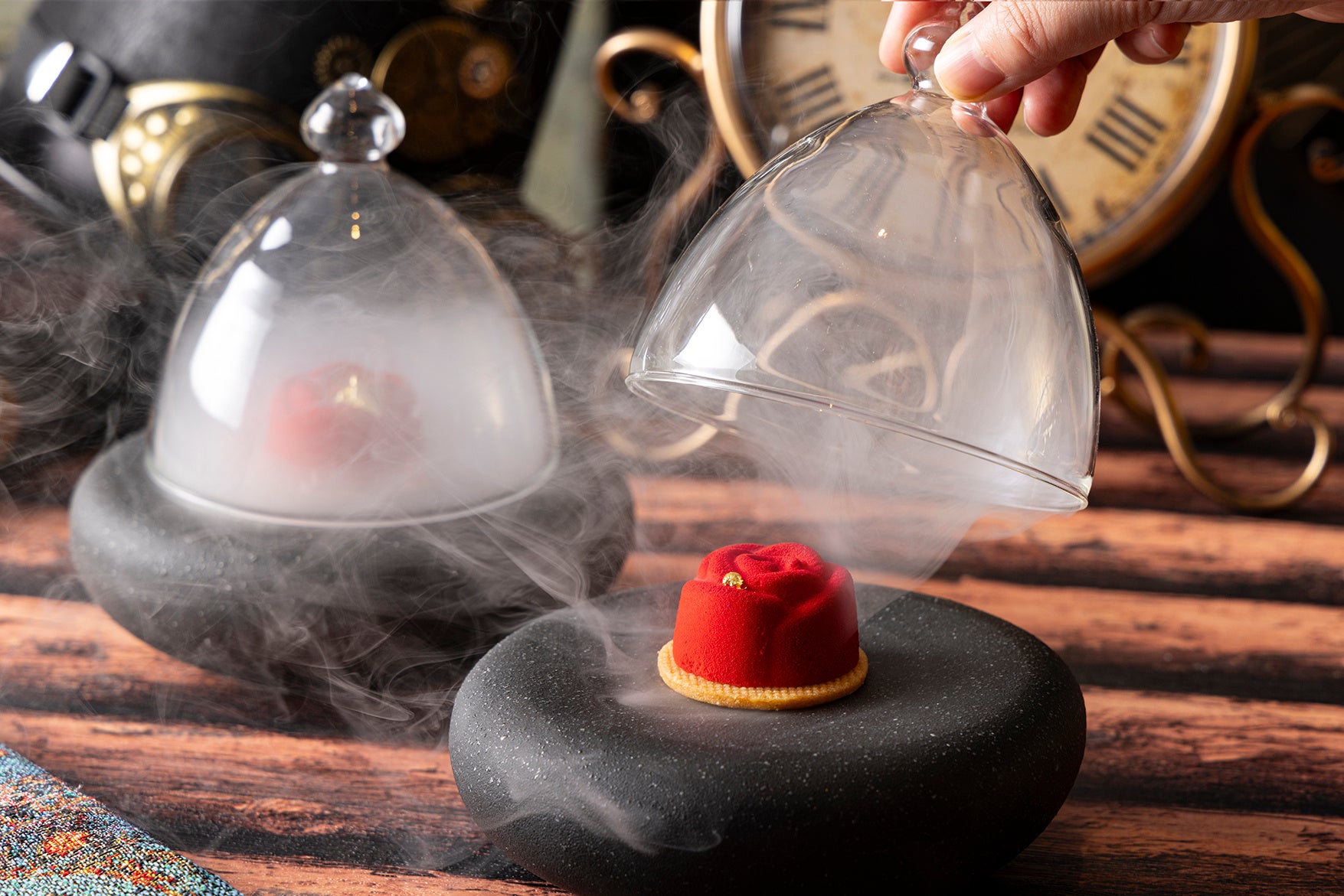 シェフが目の前で魔法をかけて仕上げる3種類のスペシャルスイーツは、チョコレートウォルナッツブラウニーとシナモン風味のマシュマロに魔法をかける「アブラカタブラ マシュマロ」、不思議なスモークと共にご用意する「スモーキーローズの謎」、極細に絞る「紫魔術のモンブラン」など、サプライズ演出と共にご賞味いただけます。