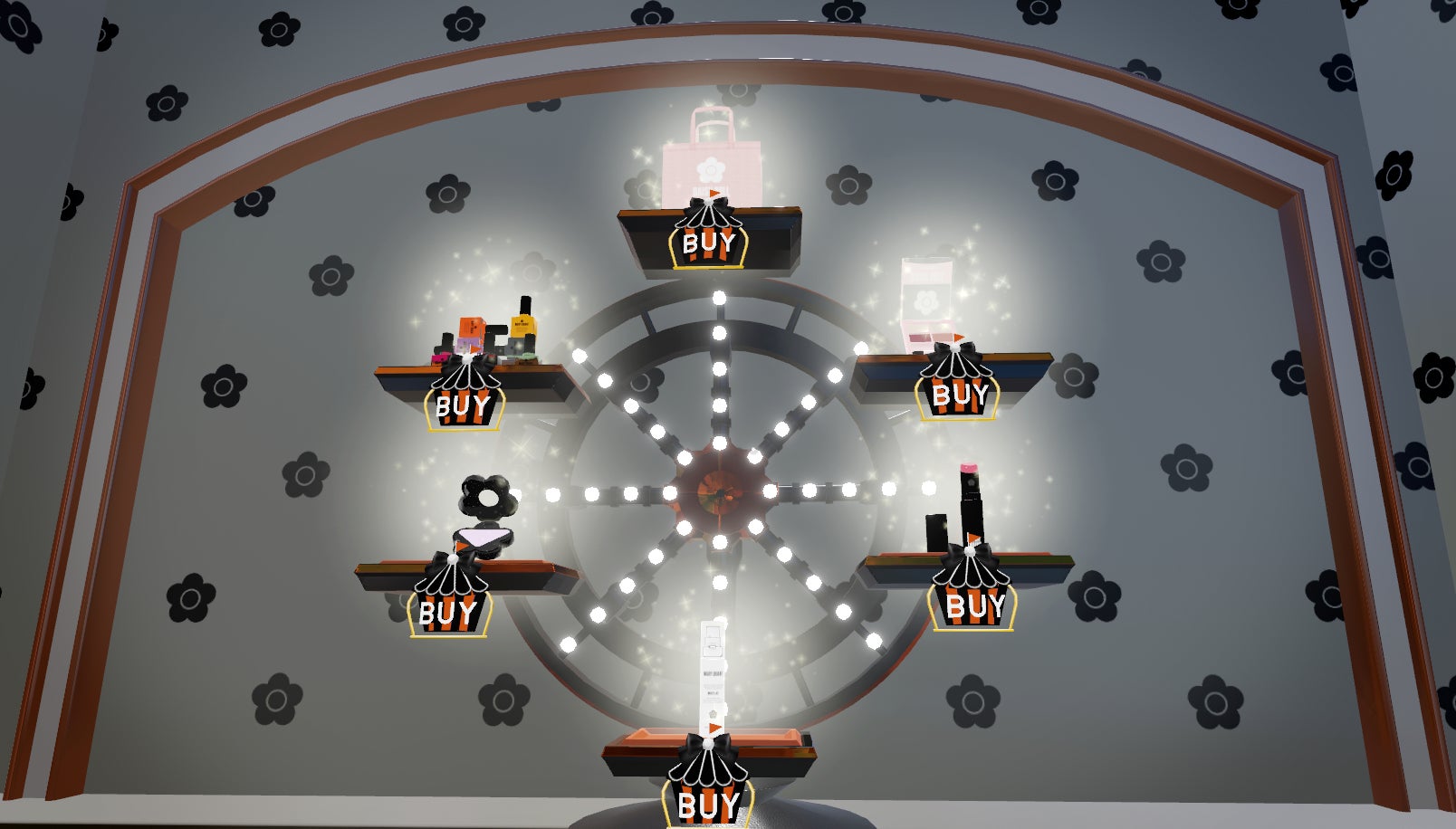 (くるくる回転する観覧車型の商品棚 BUYボタンからリアル商品の購入が可能)