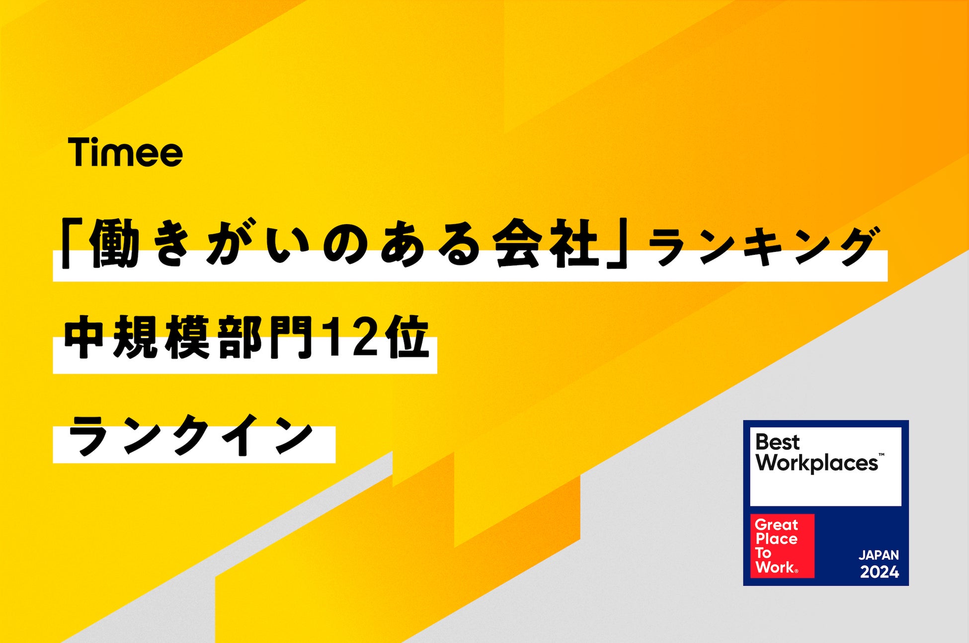 スキマバイトサービス「タイミー」を提供する株式会社タイミー(所在地:東京都港区、代表取締役:小川 嶺)は、Great Place to Work® Institute Japan(以下、GPTWジャパン)が発表する2024年版「働きがいのある会社」ランキングの中規模部門において、12位に選出されたことをお知らせいたします。2024年度版「働きがいのある会社」調査からの初参加でしたが、2023年8月には「働きがい認定企業」に選出(※1)。そして、今回中規模部門の12位にランクインいたしました。※1 2023年9月発表「“働きがいのある会社”に認定」https://corp.timee.co.jp/news/detail-1972/
