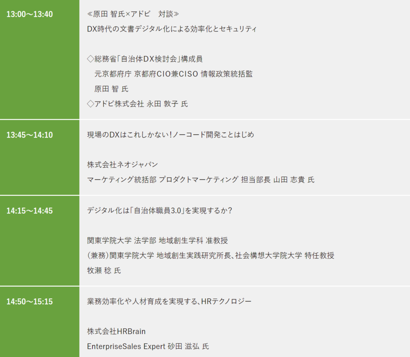 | 13:00~13:40 | ≪原田 智氏×アドビ 対談≫ DX時代の文書デジタル化による効率化とセキュリティ ◇総務省「自治体DX検討会」構成員 元京都府庁 京都府CIO兼CISO 情報政策統括監 原田 智 氏 ◇アドビ株式会社 永田 敦子 氏 |
