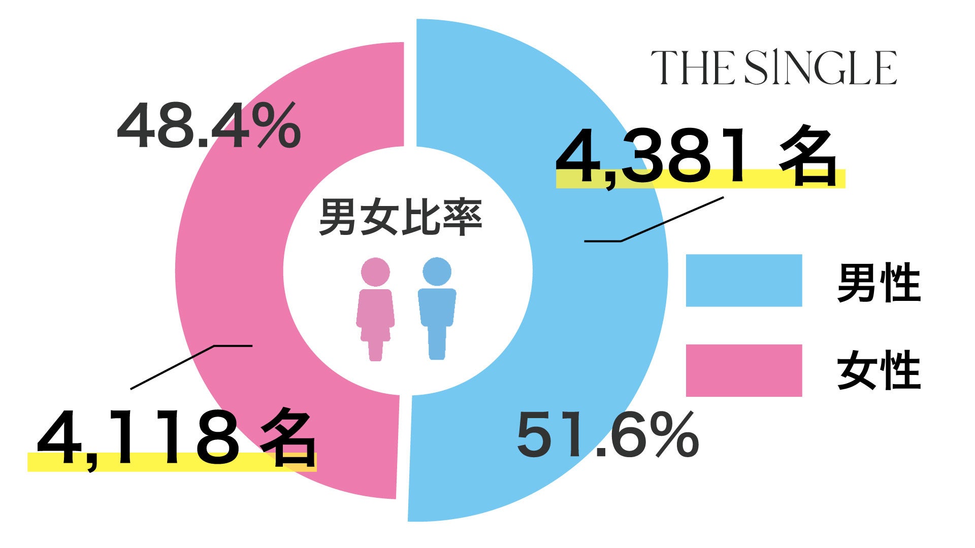 2024年5月のTHE SINGLEへの男性来店数4,381人、女性来店数4,118人を突破。男性51.6%、女性48.4%と来店数の男女比は男性の方がやや高い結果となりました。また、男性来店数のうち初めて来店した男性は1,205人、2回以上来店した男性は3,176人、女性来店数のうち初めて来店した女性は842人、2回以上来店した女性は3,276人でした。