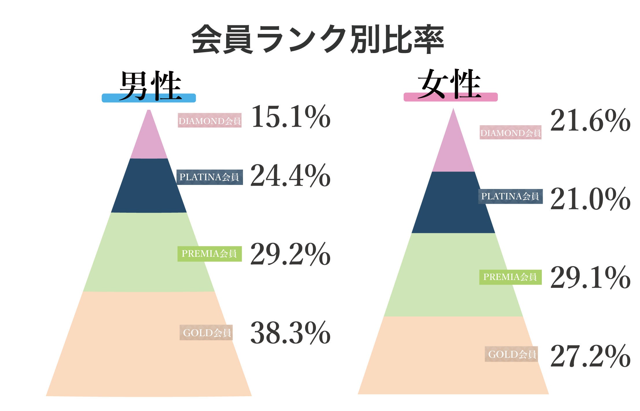 2024年5月のTHE SINGLEの会員ランク別比率は、男性は、DIAMOND会員が15.1%、PLATINA会員が24.4%、PREMIA会員が29.2%、GOLD会員が38.3%となりました。また、女性は、DIAMOND会員が21.6%、PLATINA会員が21.0%、PREMIA会員が29.1%、GOLD会員が27.2%となりました。
