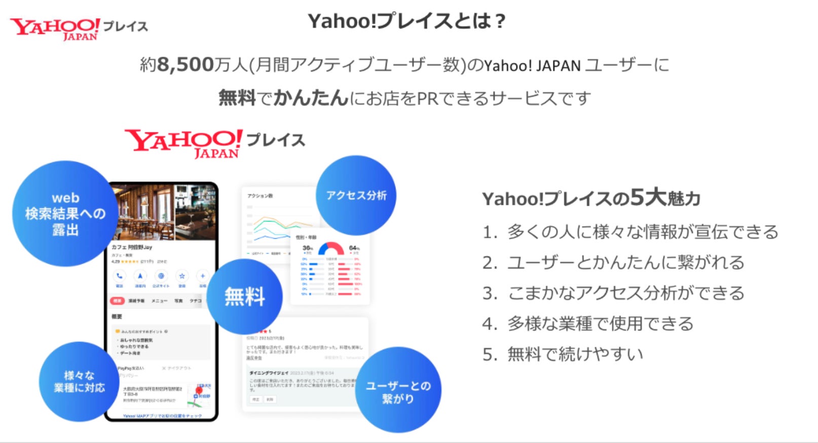 従来のGoogleマップを活用した集客に加えて、約8,500万人※1のYahoo! JAPANユーザーに無料でかんたんにお店を告知できる「Yahoo!プレイス」も活用することでより一層、実店舗の集客向上が期待できます。