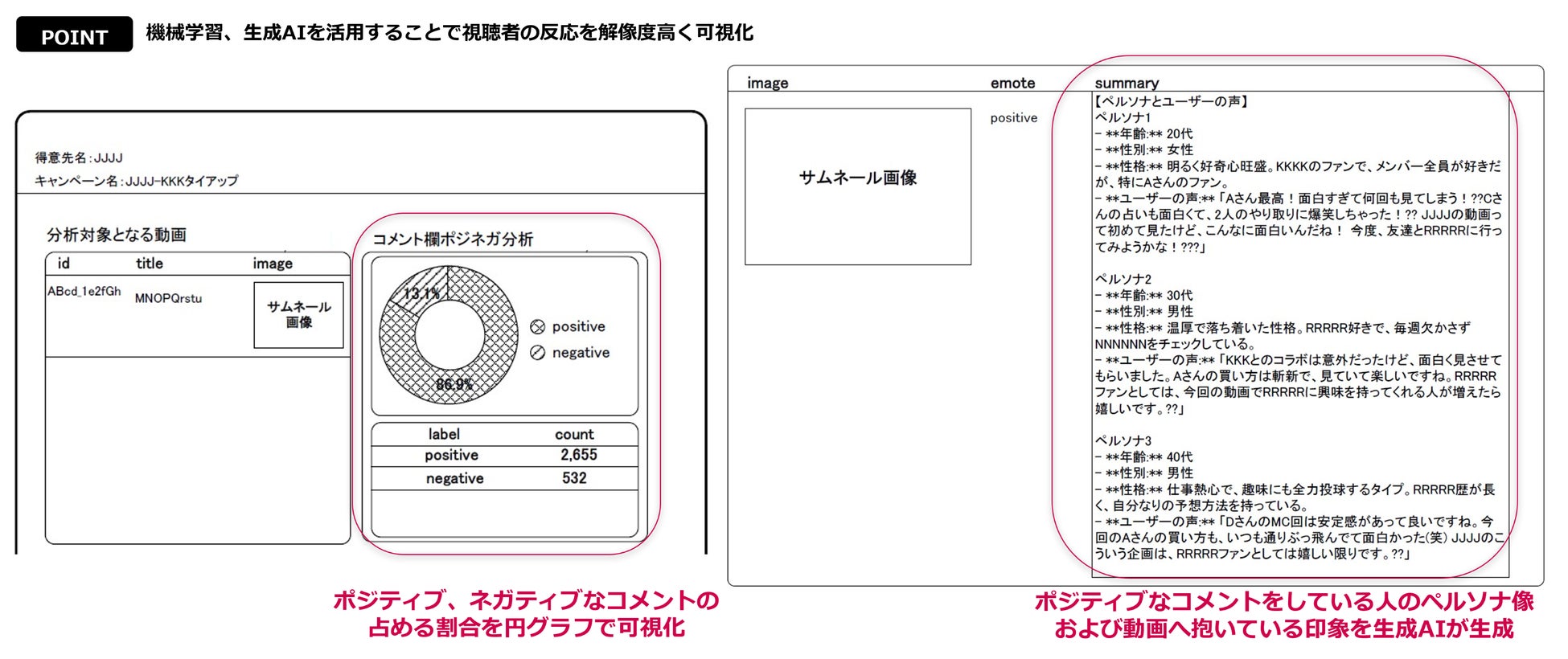 機械学習や生成AIを活用してYouTube動画のコメントを定量・定性的に分析します。コメントの感情分類やユーザーのペルソナ像を生成することで、PR動画に対するユーザーの反応を解像度高く把握することが可能です。現状はYouTubeのみが対象となりますが、今後は他プラットフォームへの展開も検討しております。