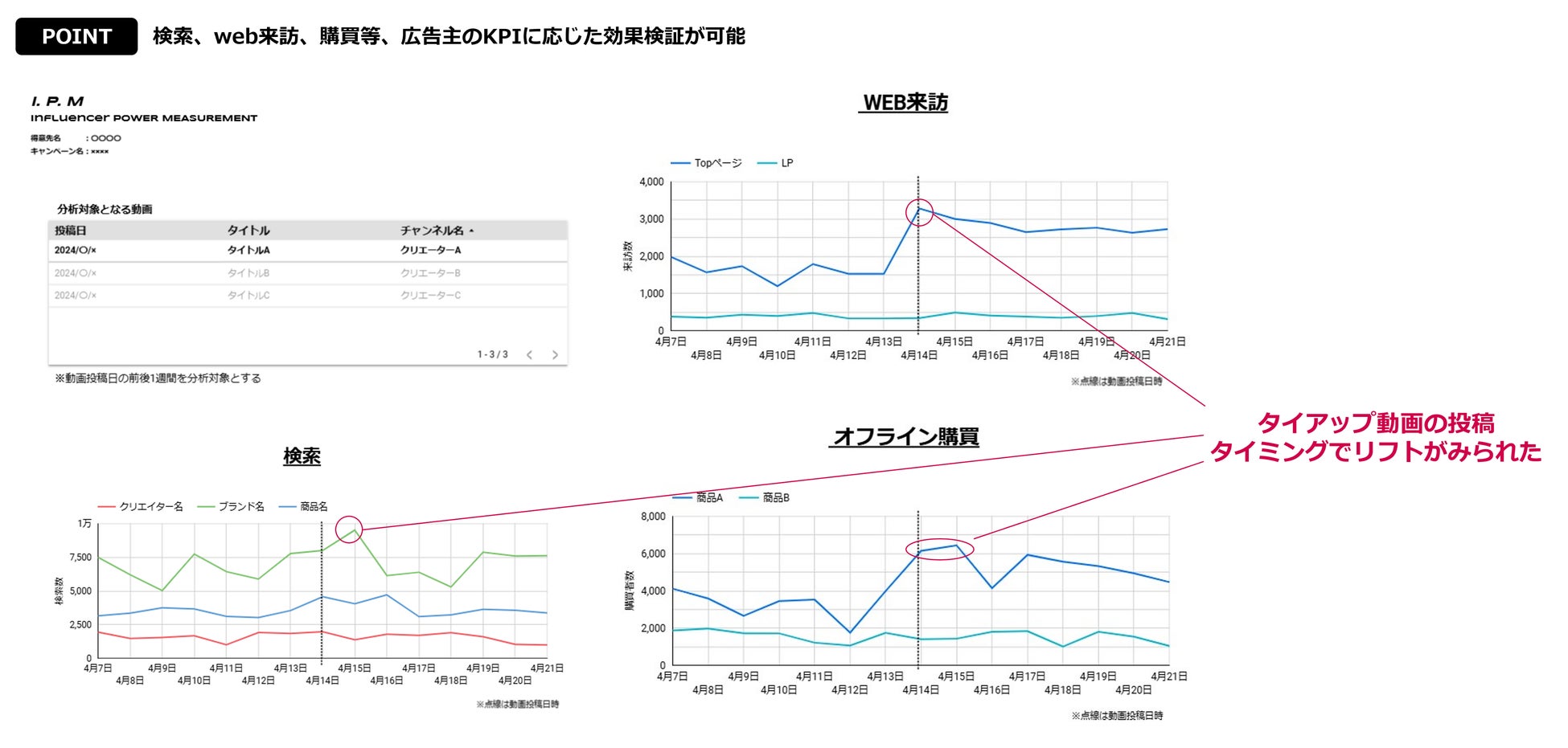 施策前後でのKPIデータ数の時系列的な推移を可視化することで、PR施策が広告主のKPIに寄与していたかを検証します。検索、web来訪、来店、購買など幅広いKPIデータの活用が可能で、複数のKPI、YouTubeやSNSなど複数の媒体を横断的に分析することができます。