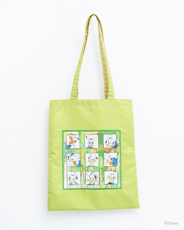 さまざまな表情のミッキーマウス、ドナルドダックがプリントされたフラットトートバッグ。A4サイズが収まり、裏地にはポケット付きでメインバッグとしてもサブバッグとしても使えるアイテム。サテン地が華やかさをプラスしてくれます。アクリルキーホルダーをバッグチャームとして飾るのもおすすめです。