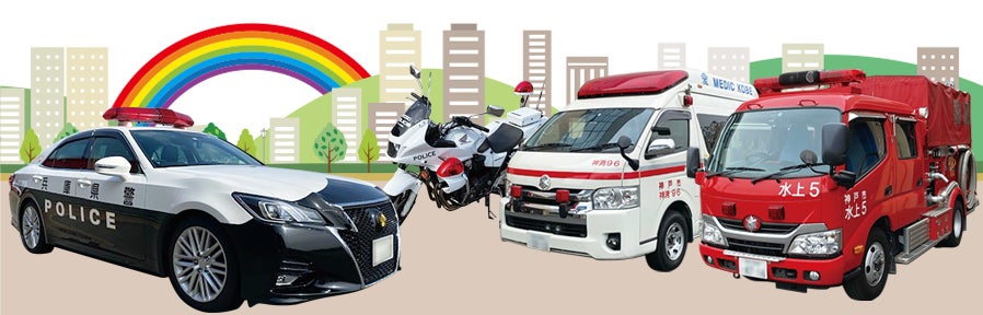 パトカー、消防車、救急車をはじめ普段見る機会が少ない水陸両用車も展示され記念撮影ができます。親子交通安全教室、地震のことを知る防災教室や、水消火器・AED使用の体験コーナーなど、警察官や消防士のみなさんが優しく指導してくれます。他にも消防レスキュー隊が高所から負傷者を救出するデモンストレーション、イベントのフィナーレには兵庫県警察音楽隊による演奏会もお楽しみいただけます。