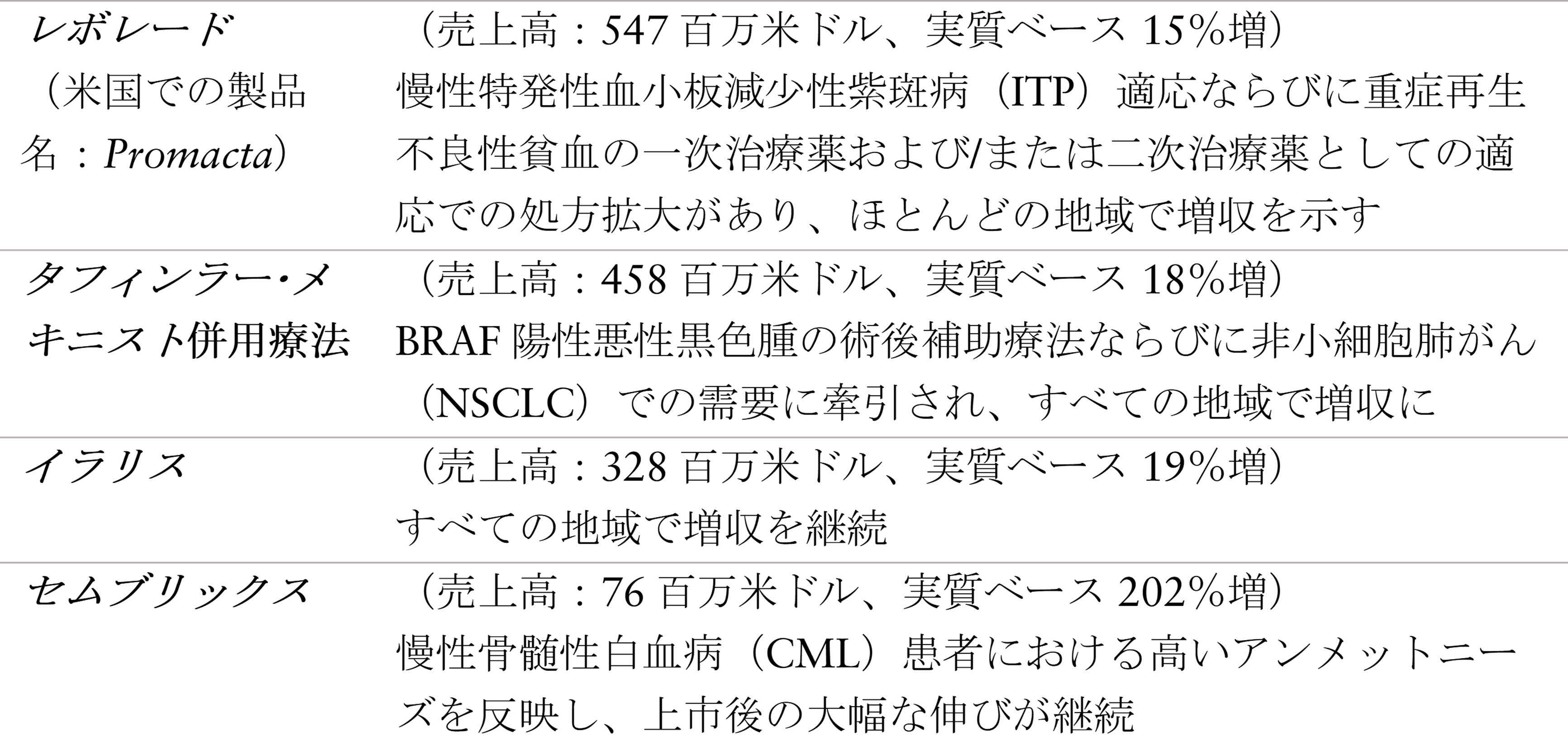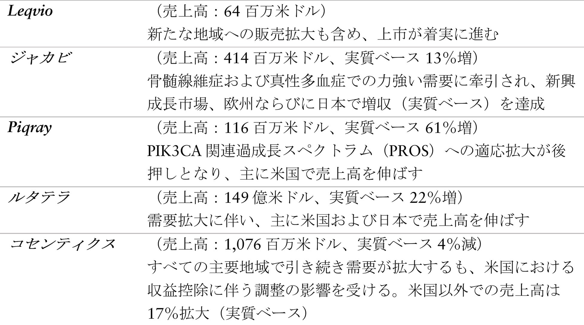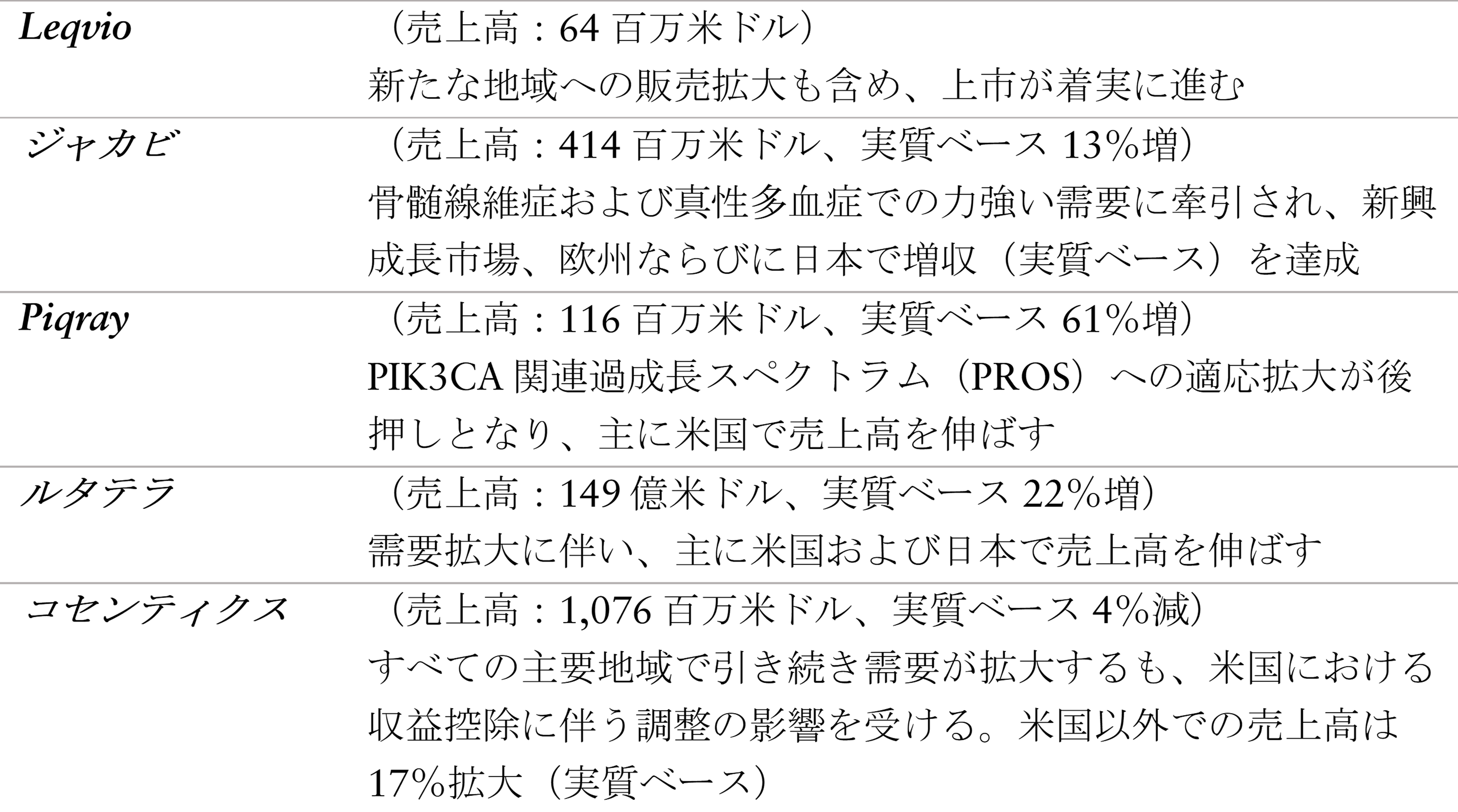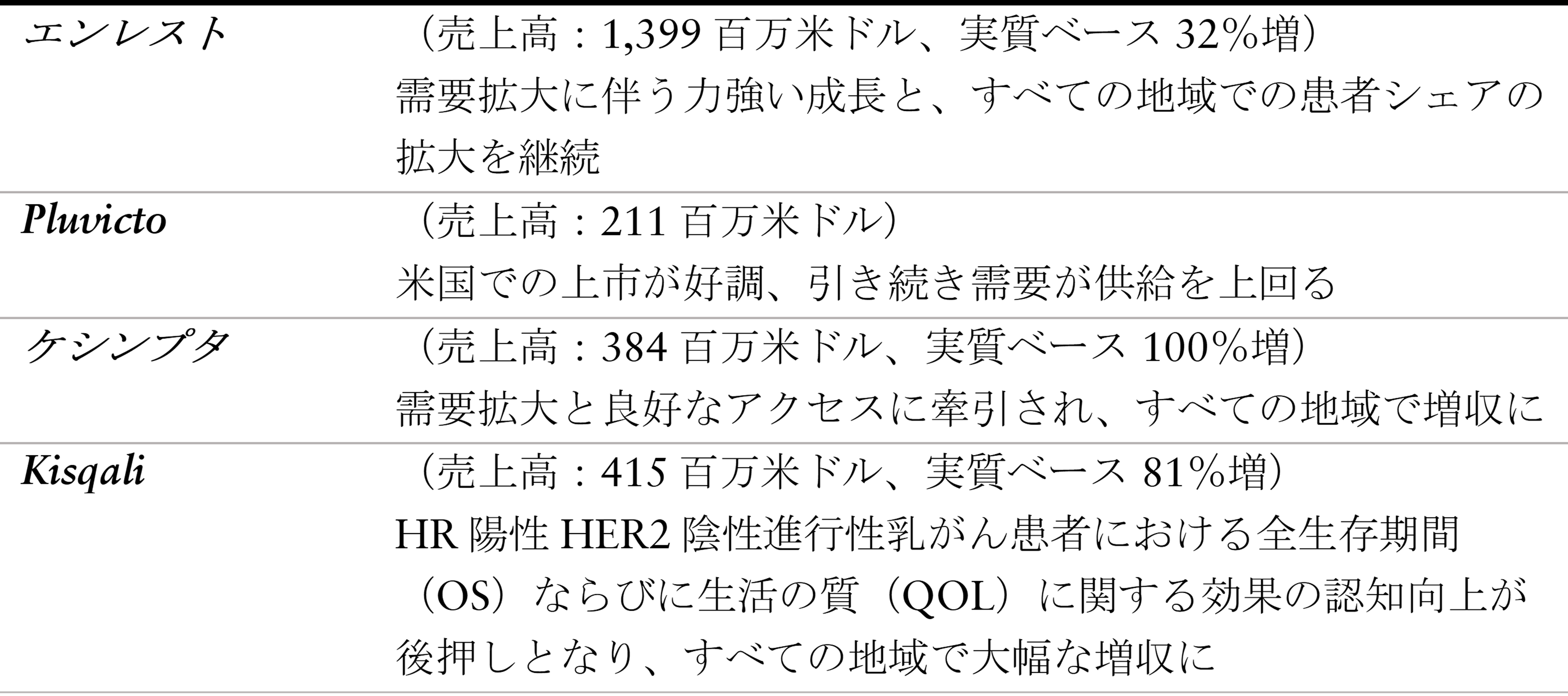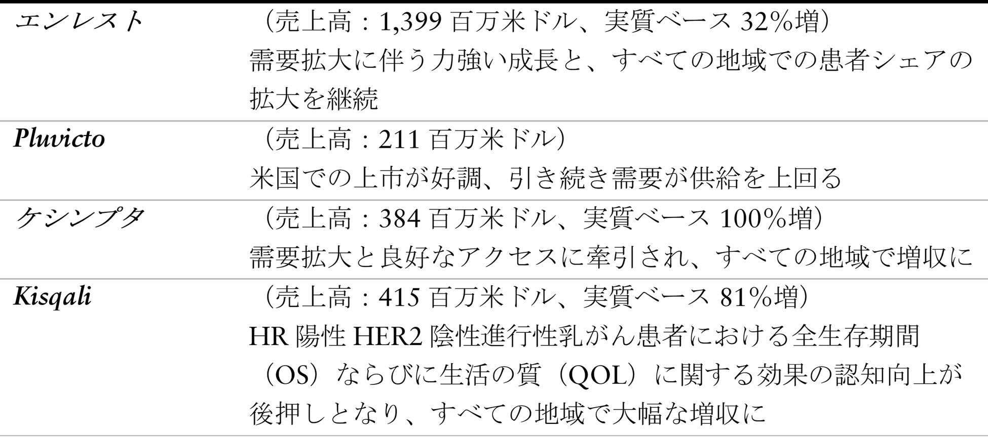 成長は、エンレスト、Pluvicto、ケシンプタ、Kisqali、セムブリックスの力強い業績に牽引される