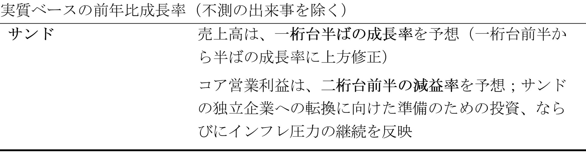 サンドの売上高は8%増(実質ベース、米ドルベース 4%増)となり、コア売上高営業利益率は3%増(実質ベース、米ドルベース 2%減)