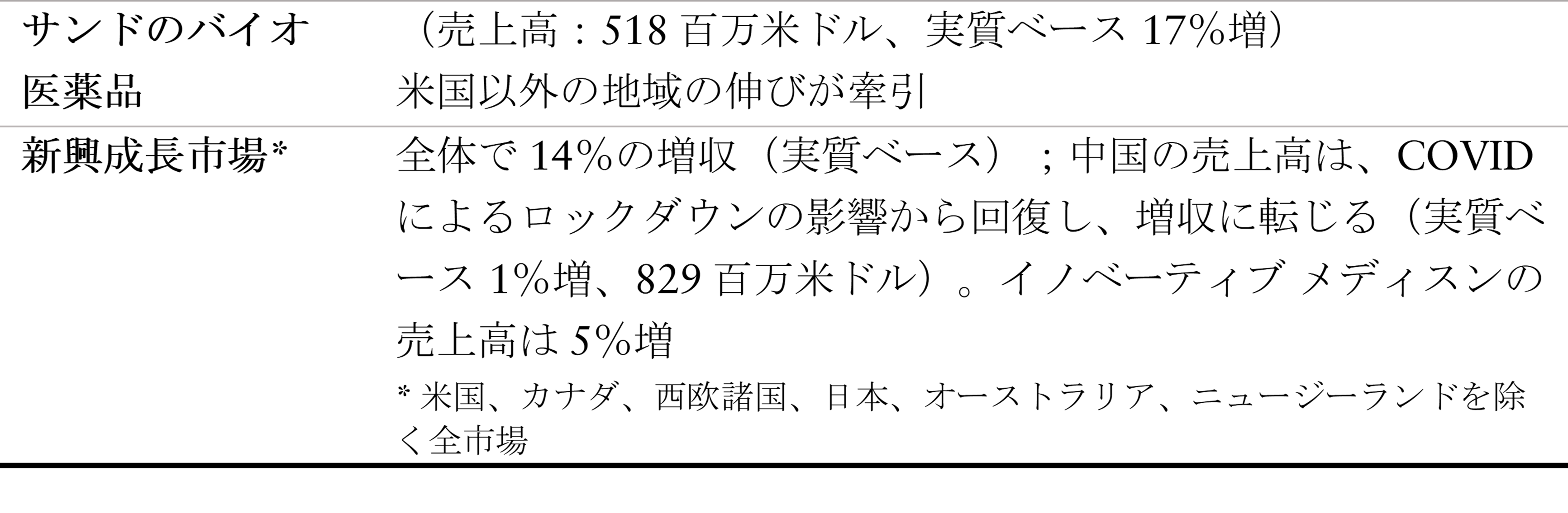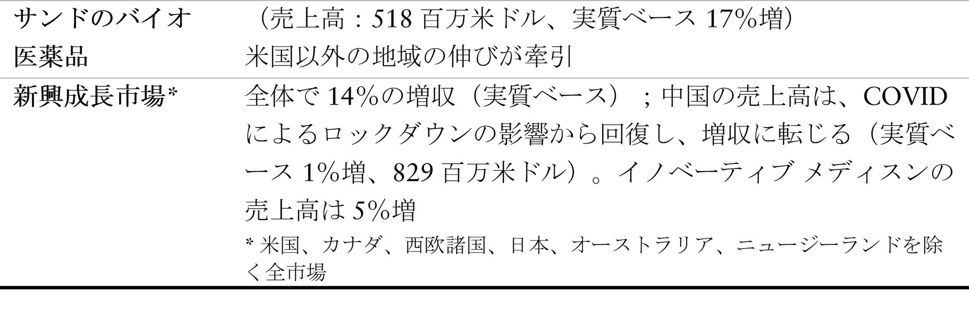 サンドの売上高は、販売量増加による15ポイントの貢献があり、24億米ドル(4%増、実質ベース 8%増)となりました。売上高の伸びは、前年の新製品上市に伴う勢いの継続と、風邪・咳の流行が拡大した欧州に主に牽引されました。価格によるマイナス影響は、7ポイントでした。米国以外の売上高は、実質ベースで12%拡大しました。バイオ医薬品の全世界での売上高は、米国以外の地域の伸びに牽引され、518百万米ドル(11%増、実質ベース 17%増)に増加しました。