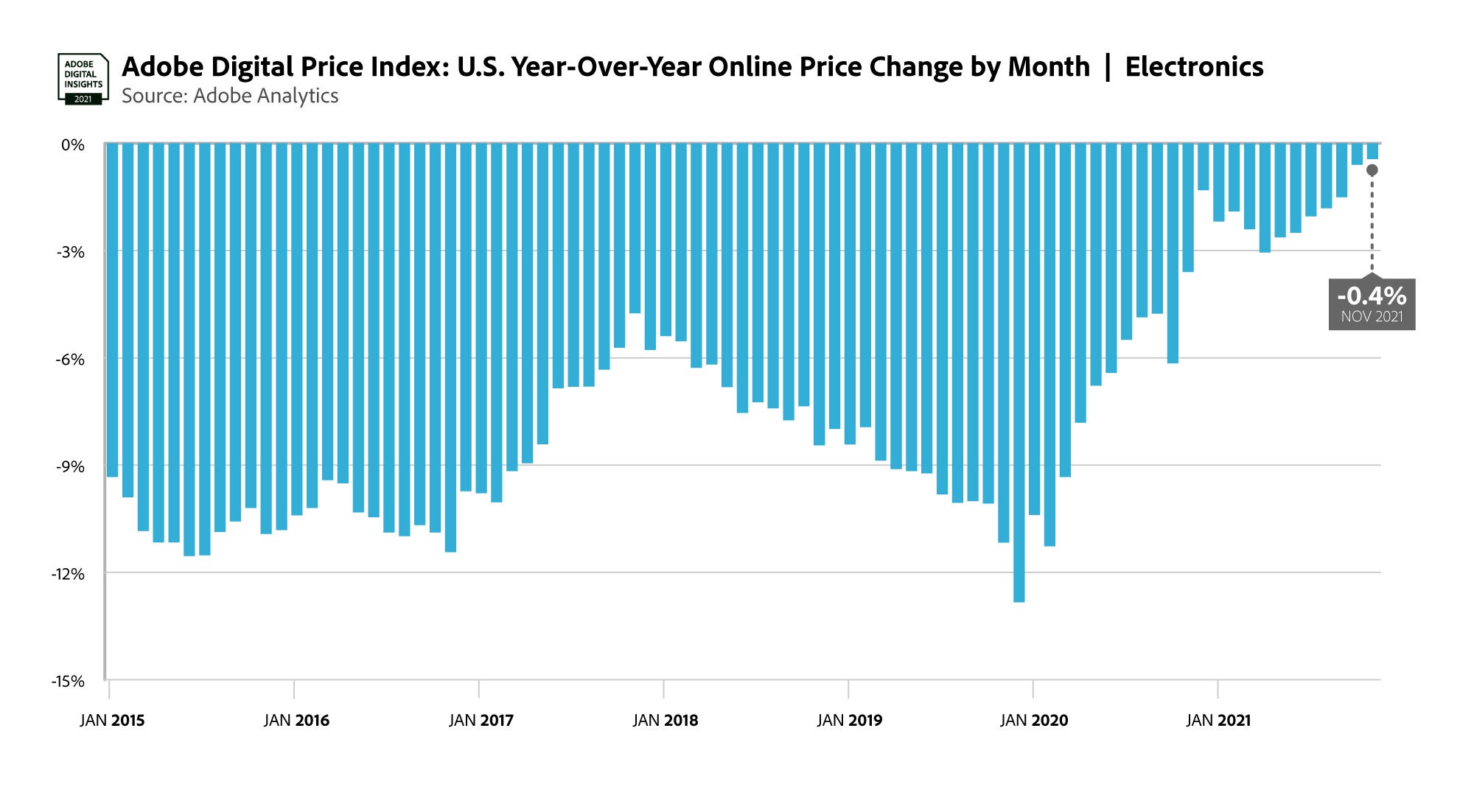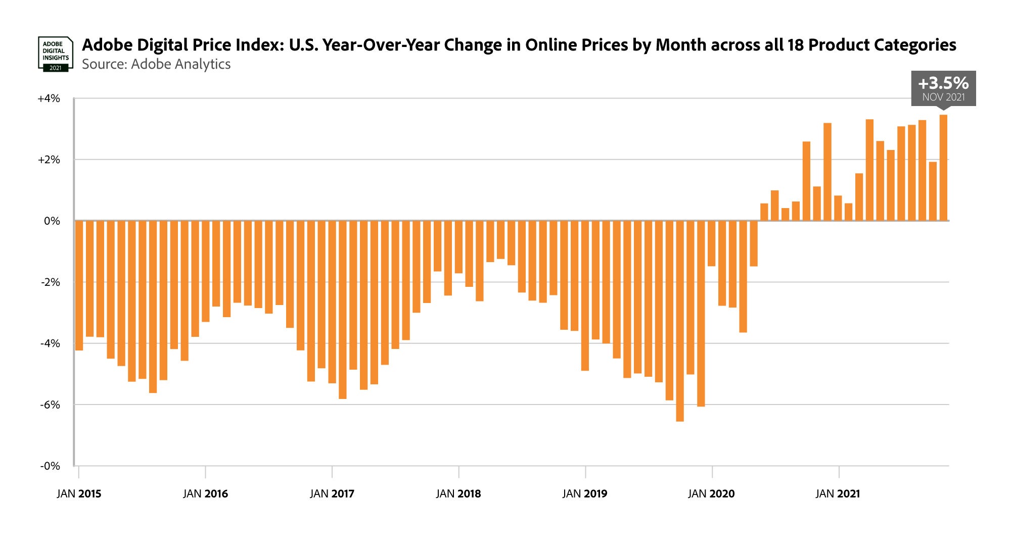 Adobe(Nasdaq: ADBE)(本社:米国カリフォルニア州サンノゼ、以下アドビ)は本日、米国における最新(2021年11月時点)のオンラインインフレデータ「Adobe Digital Price Index(DPI)」を発表しました。これによると、オンライン価格は、前年同月比で3.5%の上昇で過去最高を記録しましたが、ホリデーシーズン中に実施された割引により前月比では2%の下落となりました。この結果は、アドビが2014年にデジタルエコノミーの追跡調査を開始して以来、最高の前年比上昇率であり、18か月連続で前年比オンライン価格が上昇したことになります。中でもアパレルは、前年同月比で17.3%の上昇、前月比ではわずか0.4%の下落となり、過去最高のインフレ率を記録しました。なお、米国では現在、4ドルのうち1ドルがオンラインで消費されており(注1)、デジタルエコノミーは経済全体の重要な構成要素となっています。