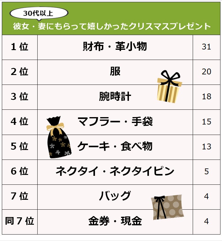 続いて、30代以上の男性145人に「彼女や妻にもらって嬉しかったクリスマスプレゼント」を聞いたところ、1位は「財布・革小物(31人)」でした。やや差が開いて2位「服(20人)」、3位「腕時計(18人)」、4位「マフラー・手袋(15人)」が続きます。