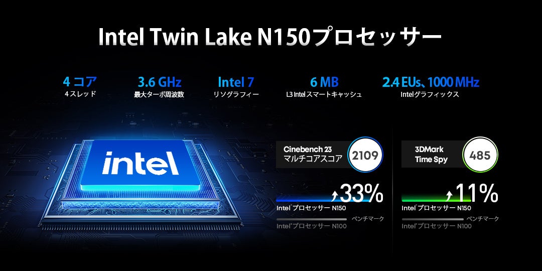 MiniBook X N150の核となるのは、4コア4スレッド・最大3.6GHzブーストのTwin Lake N150プロセッサー。性能面では、前世代N100と比べCinebench R23マルチコアスコアで33%向上、3DMark GPU性能も11%向上。実測データでは、CPU-Zベンチでシングルスレッド約320/マルチスレッド約1,280スコア。 PassMark総合スコアは約5,600点に達し、軽量ノートPCとしては高い性能を発揮します。