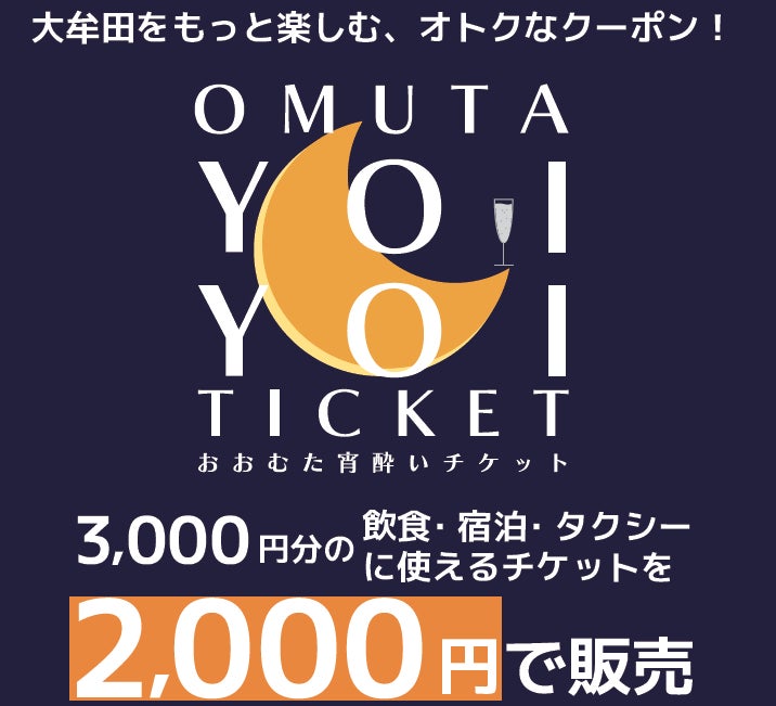 11月と1月に、三池港に現れる「光の航路」のほか、市内で開催される様々なイベント等に訪れる方に、市内飲食店や宿泊などをお楽しみいただくため、プレミアム付きチケット「おおむた宵酔いチケット」を販売します。