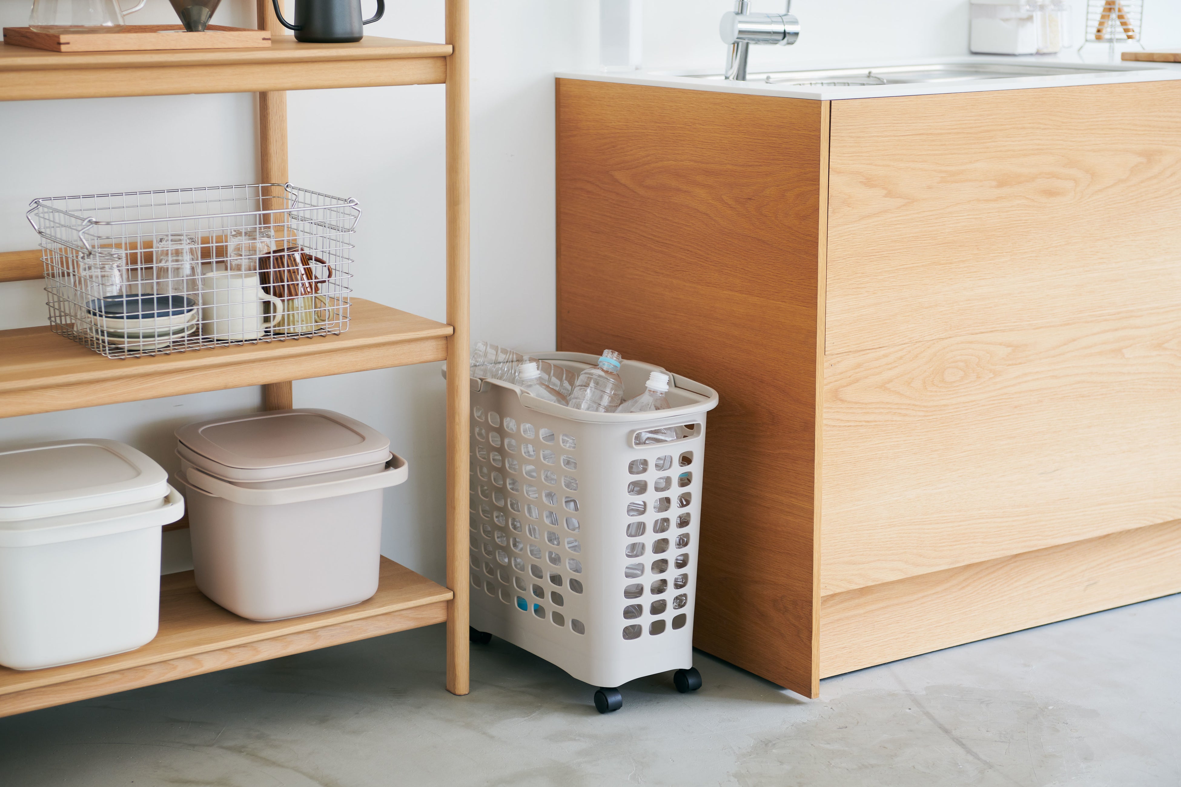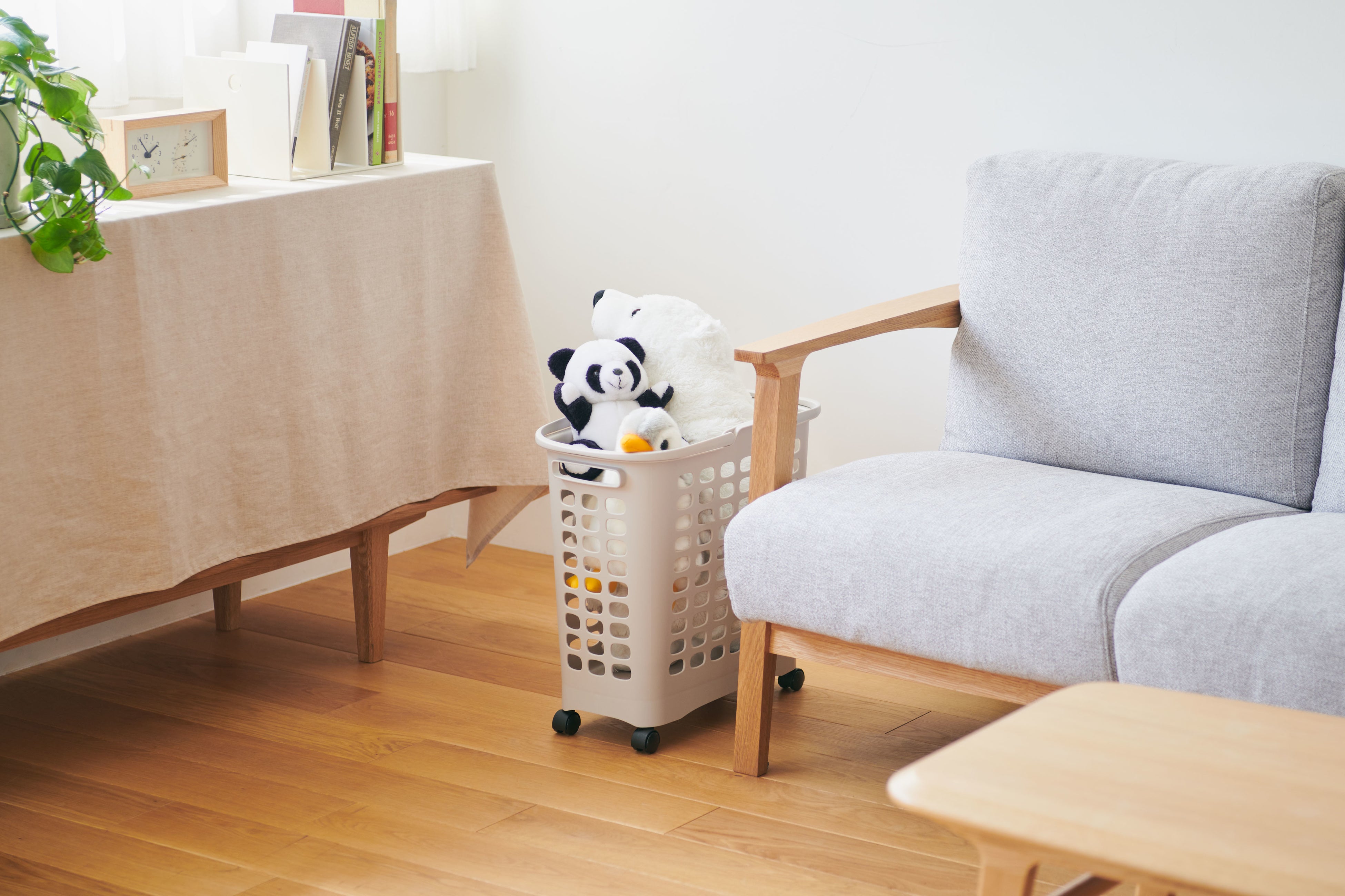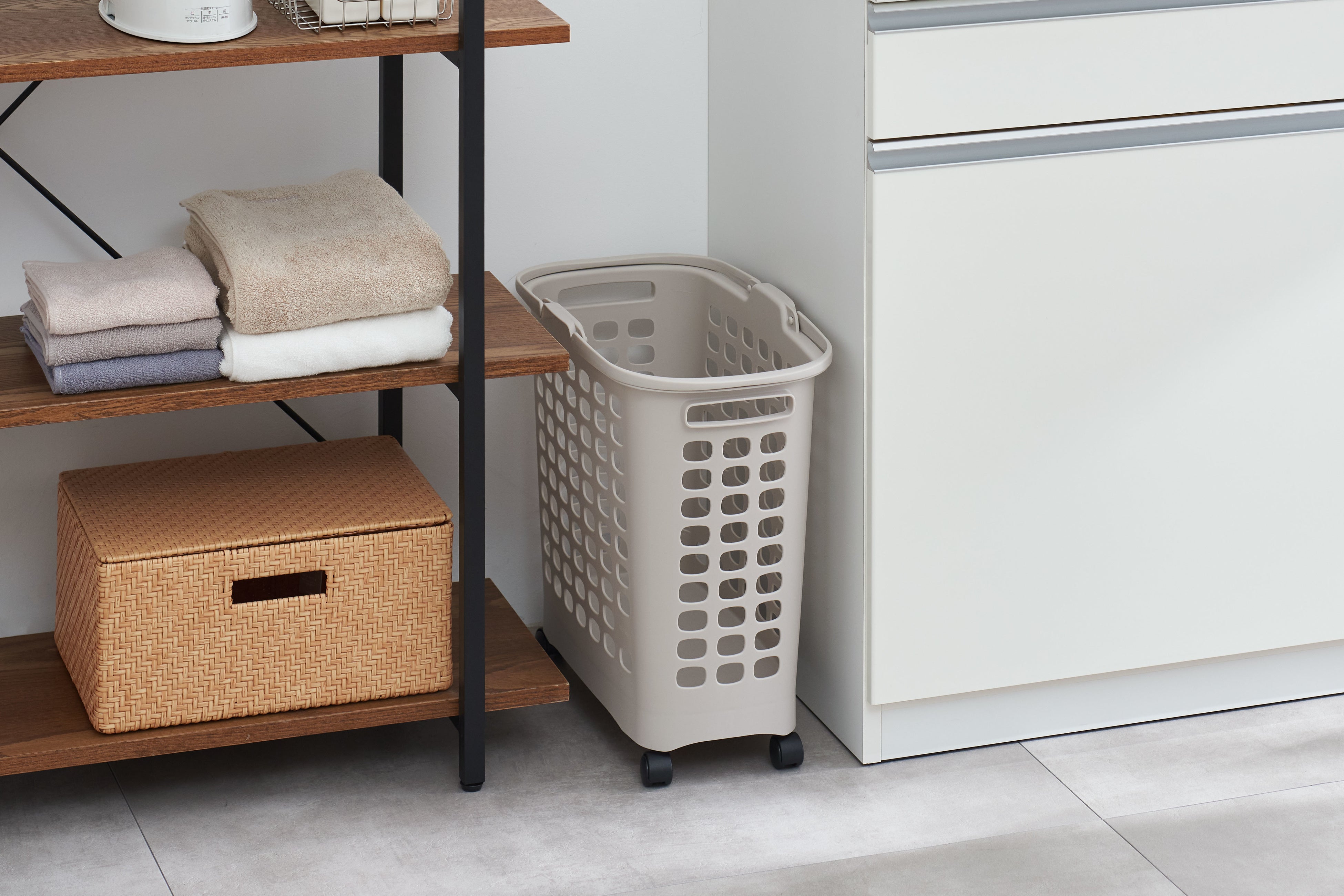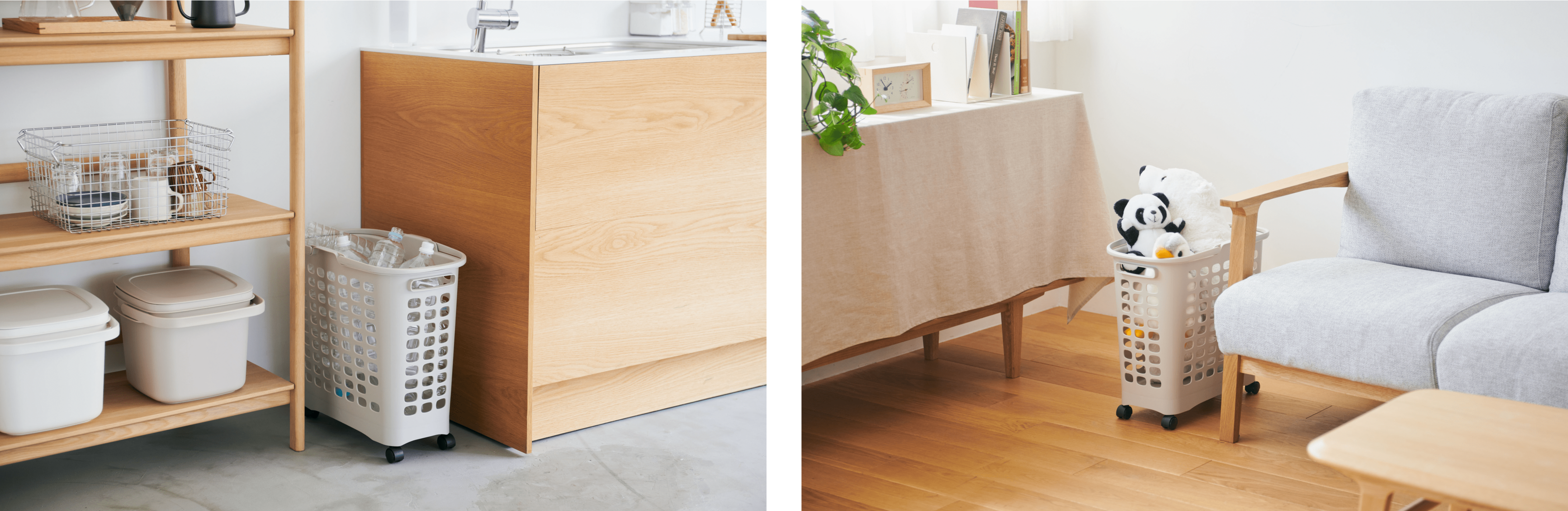 インテリアになじむライトグレーのカラーリングとデザイン性のあるビジュアルのため、脱衣所で使用するランドリーバスケットとしてはもちろん、キッチンやリビング、子供部屋やクローゼットなど、家中の様々な場所でお使いいただくことができます。キッチンでは、食材や調理品のストックカートやペットボトルのゴミ箱として、子供部屋ではぬいぐるみなどおもちゃの収納カートとしても使用できるため、多様なライフスタイルやシーンにオススメです。