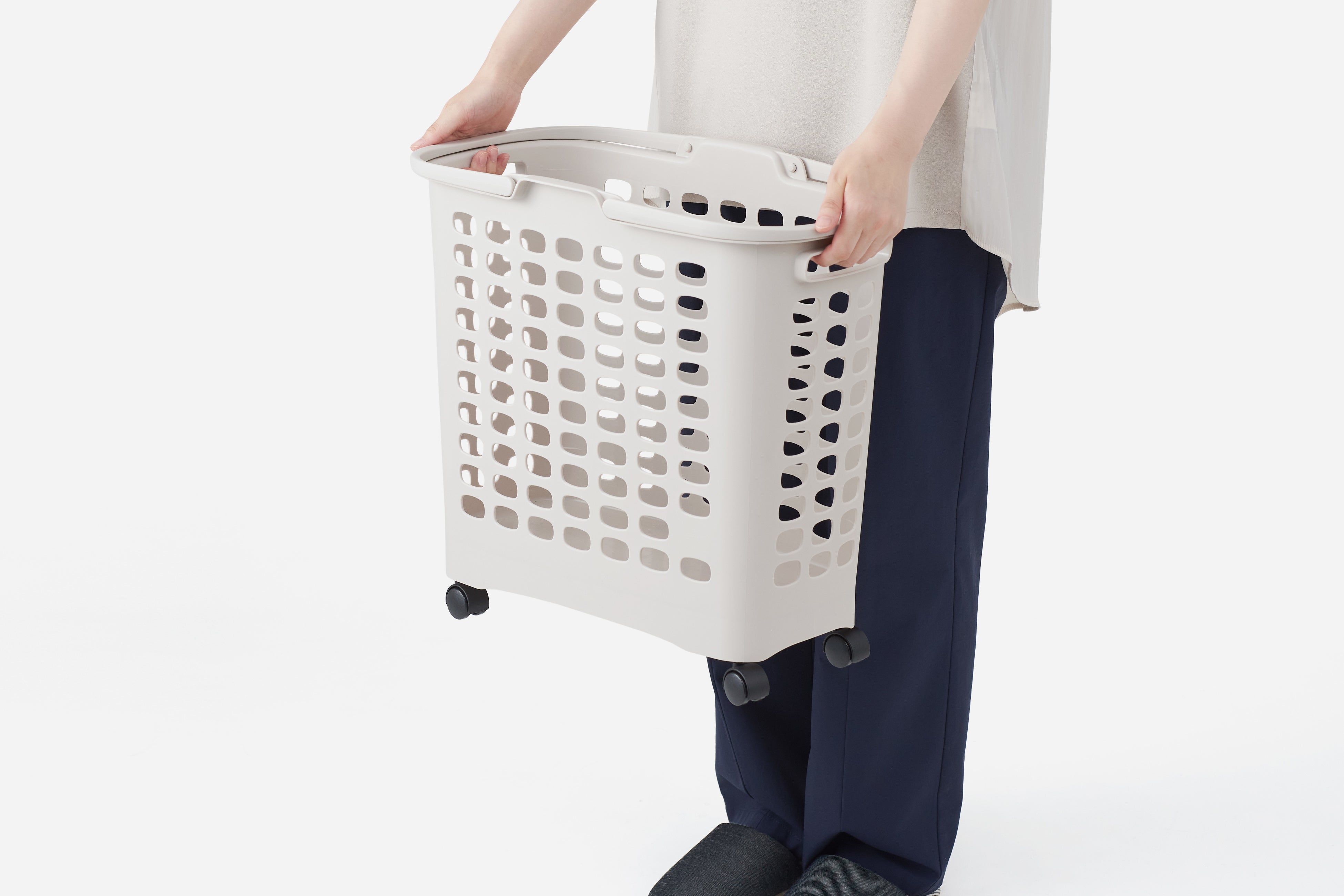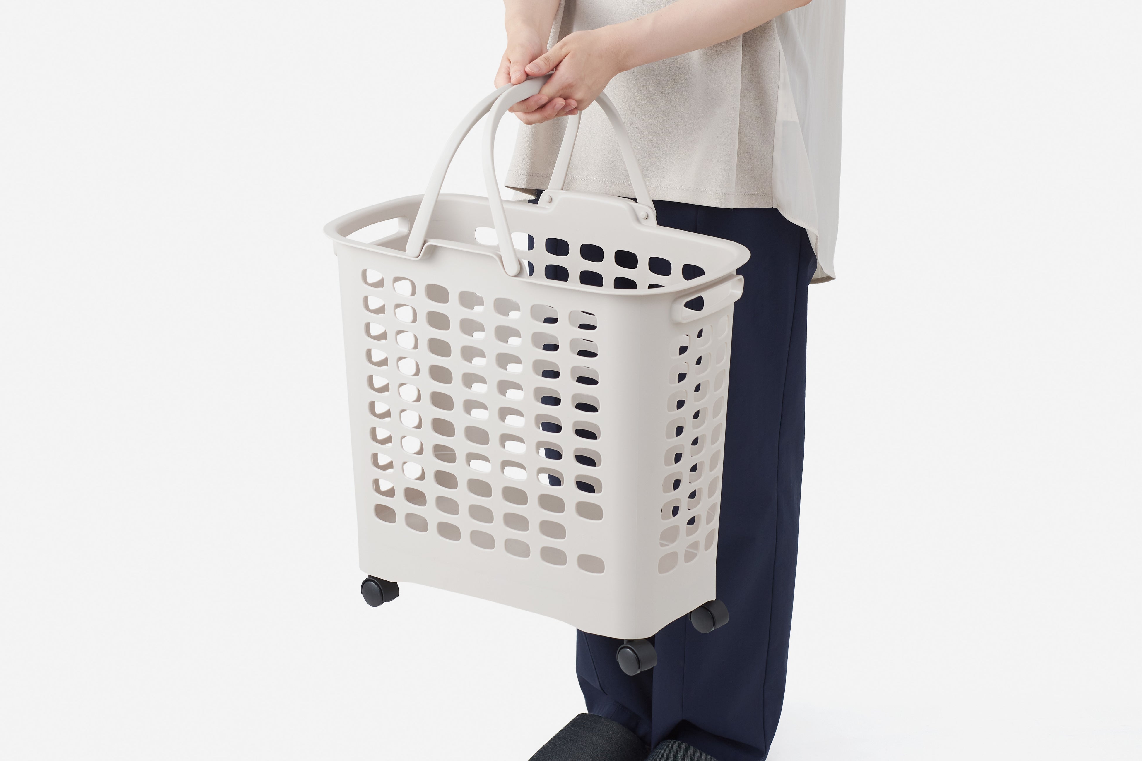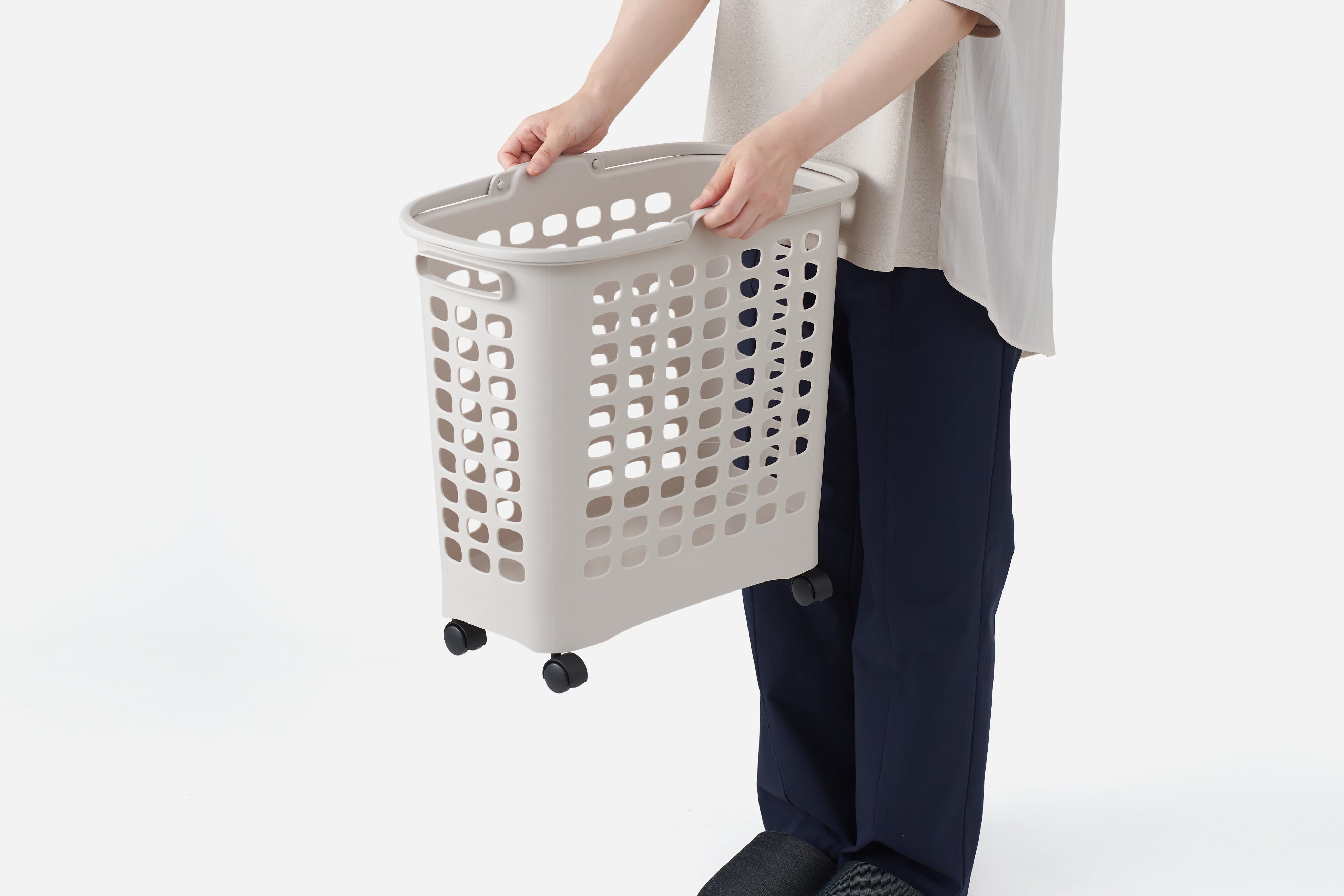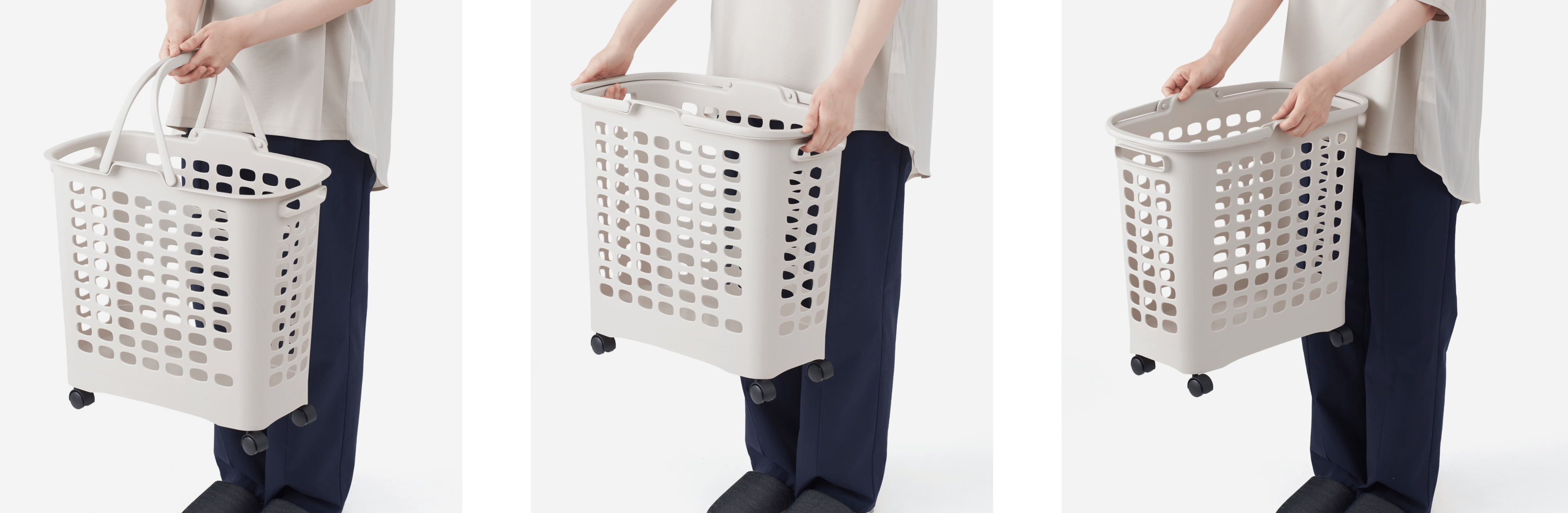 洗濯物の量が多くてしっかり両手で持ちたい時・軽くて片手で持ちたい時など、様々なシーンでご利用いただくことを想定して3 種類の持ち方ができるようにしました。