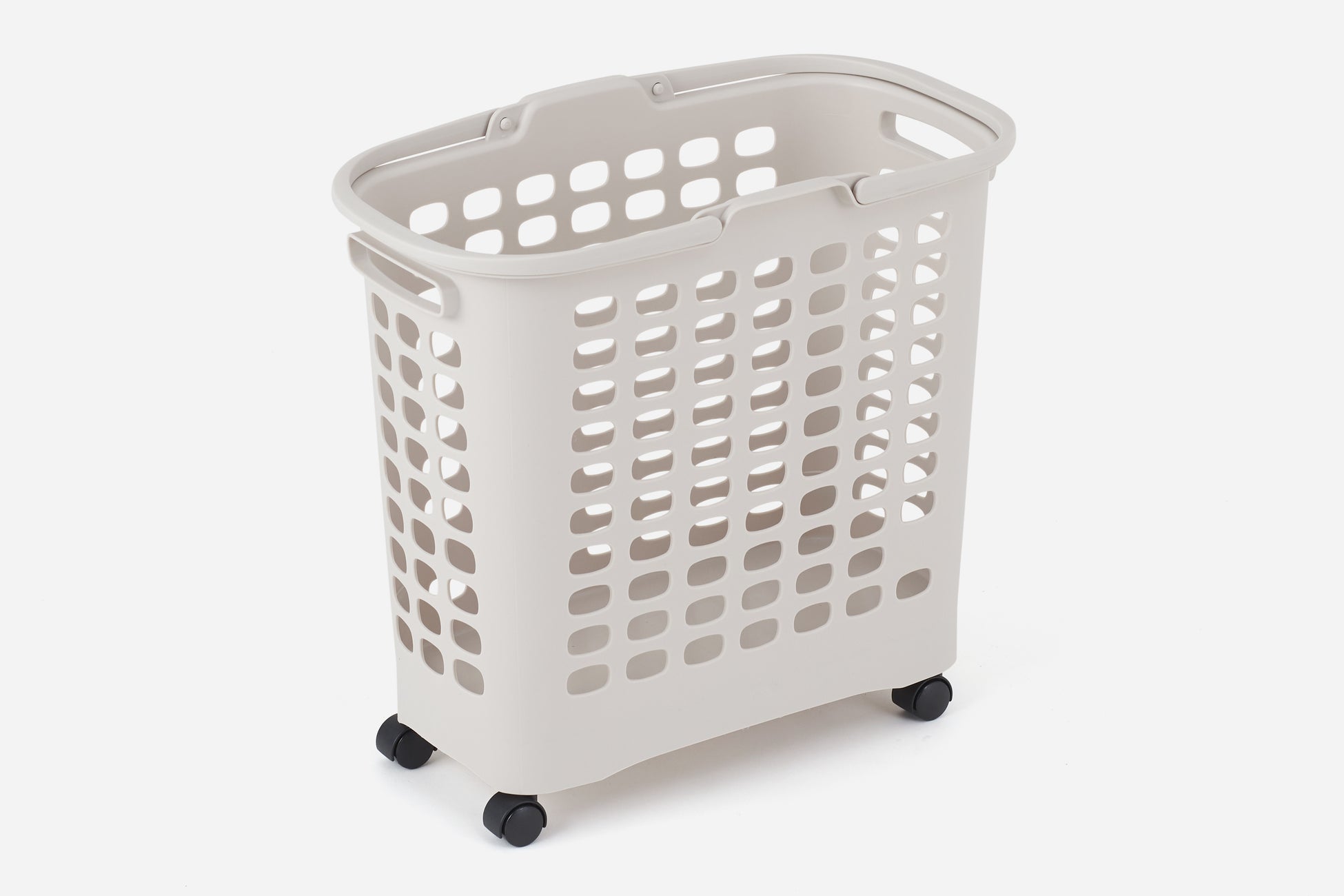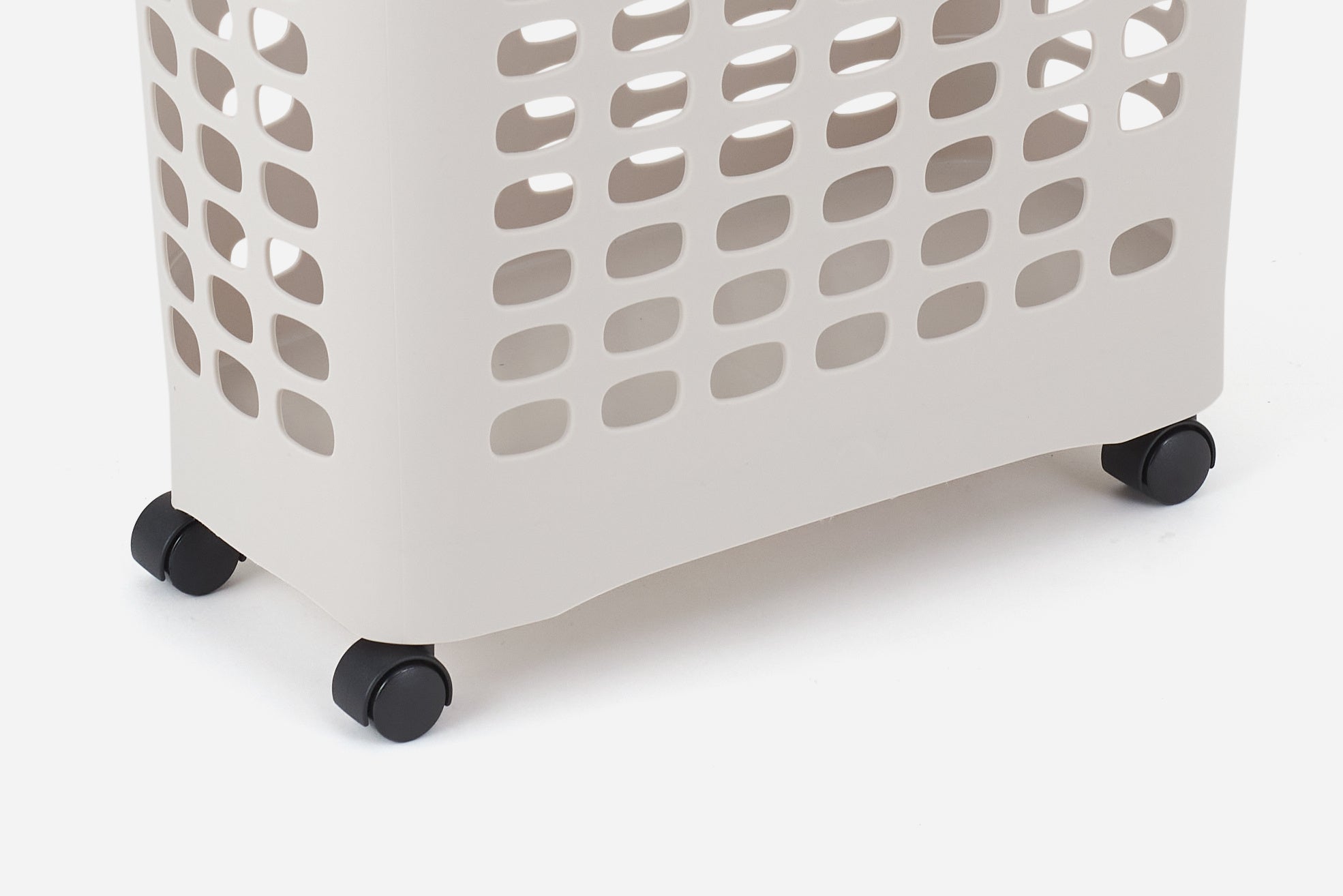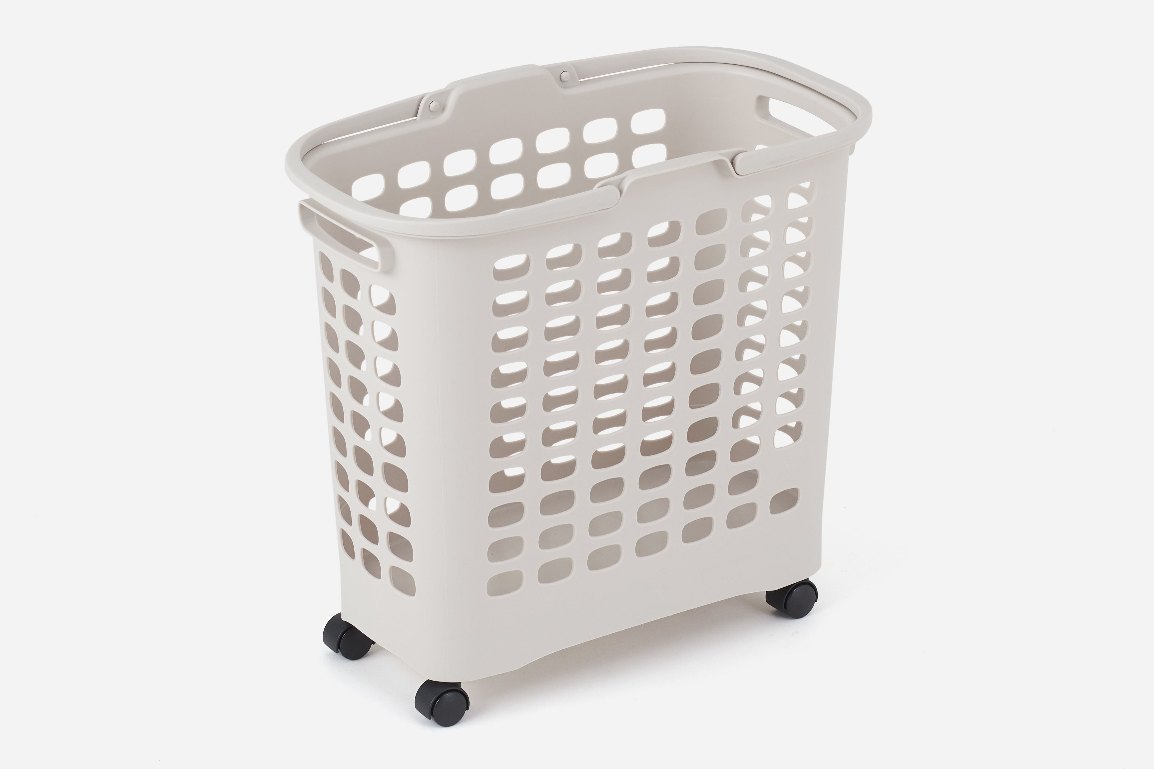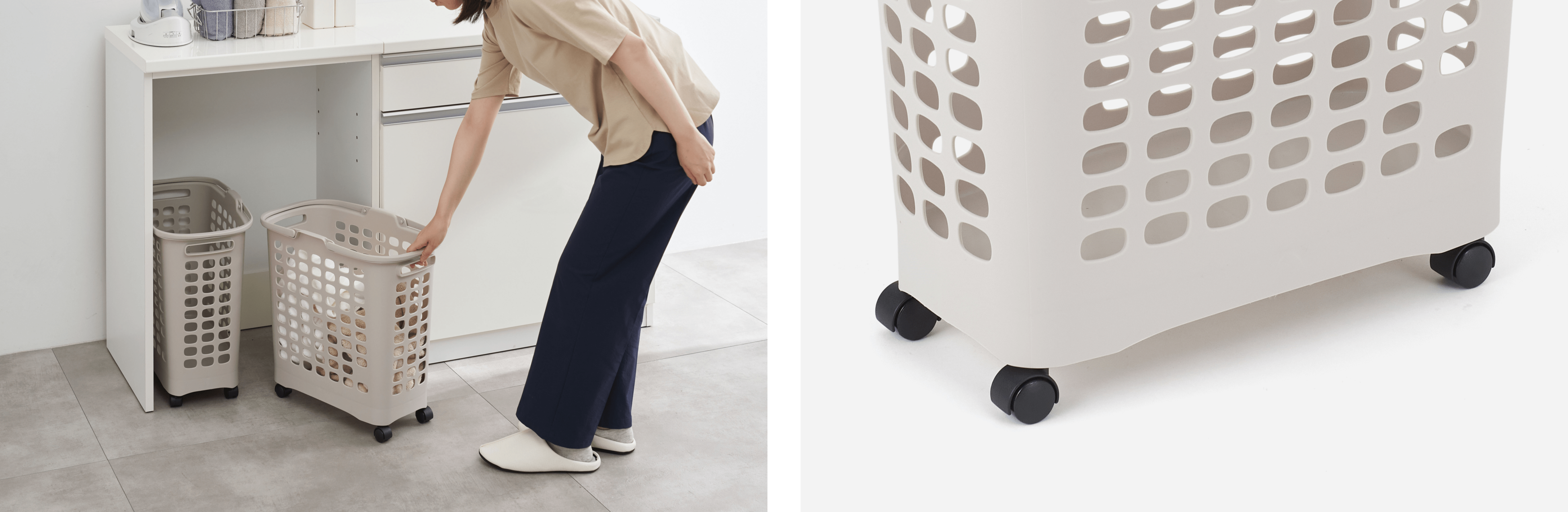 360度回転可能なキャスターは、隙間やカウンター下に収納したランドリーバスケットをサッと引き出すことができます。たっぷり洗濯物が入った状態で運ぶ際にも、キャスターがあることでお年寄りや子供も楽々運ぶことができます。