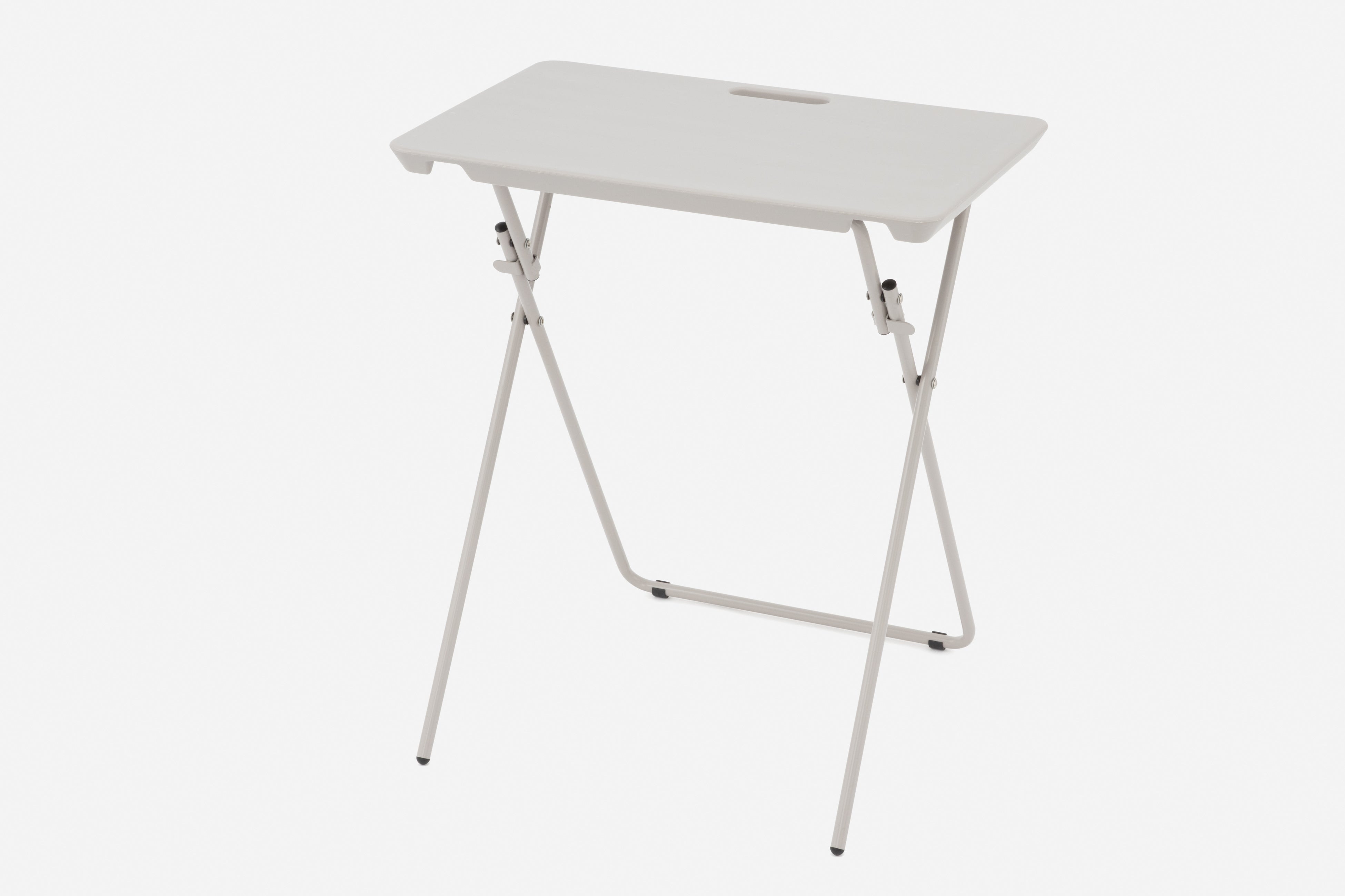 楽に運べてスッキリ収まる折りたたみデスクです。天板は樹脂製の中空構造なので約3.8kgと軽く、ハンドル付きで持ち運びも楽にできます。折りたたみ時に足のパイプが天板内に収まるので、見た目もスッキリと収納することが出来ます。折りたたんだ足がバタつかないよう、ロックされるのもうれしいポイント。テレワークや在宅でのお仕事だけでなく、腰をかがめずに立ったまま洗濯物を畳むなど、家事に取り入れるのにもオススメです。