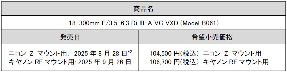総合光学機器メーカーの株式会社タムロン(代表取締役社長:桜庭省吾、本社:さいたま市)は、APS-Cミラーレス一眼カメラ対応の高倍率ズームレンズ「18-300mm F/3.5-6.3 Di III-A*1 VC VXD (Model B061)」(以下18-300mm F3.5-6.3)のニコン Z マウント用を2025年8月28日、キヤノンRFマウント用を2025年9月26日に発売します。