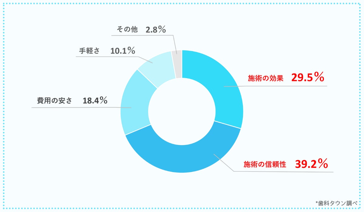 ホワイトニング施術を検討する場合、「施術の信頼性」を重視する人が39.2%を占め、ホワイトニングの「施術の効果」を重視する人は、次に多い29.5%となっています。約70%の人が「費用の安さ」よりも安全性を重視する傾向にあることが分かりました。