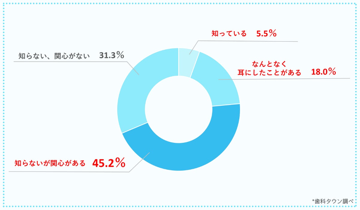「知っている」と回答した人は、わずか5.5%でした。「なんとなく耳にしたことがある」人を加えても23.5%にとどまっており、セルフホワイトニングのトラブルの実態についてはまだ十分に周知されてはいないようです。しかし、「知らないが関心がある」と答えた人は45.2%と、高い数値になっています。このことから、注意喚起に関しては把握していなかったものの、セルフホワイトニングを巡るトラブルに関心を抱く人が多いことが分かります。