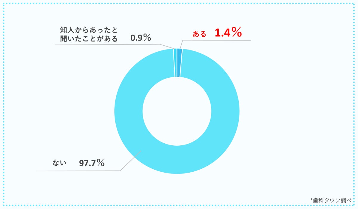 セルフホワイトニングを巡るトラブルの体験が「ない」人が97.7%を占めていますが、「ある」人も1.4%という結果に。わずかな割合ですが、歯科タウンを利用している方の中にも、実際にセルフホワイトニングのトラブル被害にあった経験を持つ人がいると分かりました。