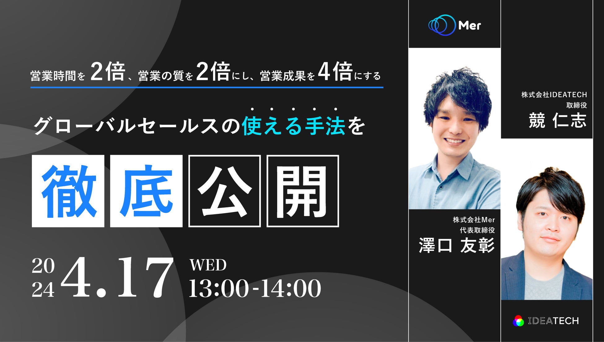ファクトに基づいたコンテンツ開発とマーケティング支援を行う、株式会社IDEATECH(本社:東京都港区、代表取締役社長:石川友夫)は、株式会社Mer(本社:東京都渋谷区、代表取締役:澤口 友彰)と共同で、2024年4月17日(水)13:00-14:00に「営業時間を2倍、営業の質を2倍にし、営業成果を4倍にするグローバルセールスの使える手法を徹底公開〜Sales Ops×コンテンツセールスで営業組織をアップデート〜」と題するオンラインセミナーを開催いたしますので、お知らせいたします。