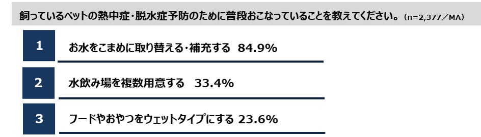 ・飼っているペットの熱中症・脱水症予防のために普段おこなっていること1位は「お水をこまめに取り替える・補充する」で84.9%。続いて2位が「水飲み場を複数用意する」で33.4%。