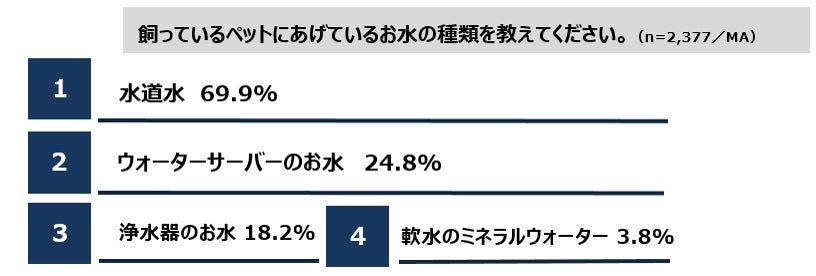 ・飼っているペットにあげているお水の種類1位は「水道水」で69.9%。続いて2位が「ウォーターサーバーのお水」で24.8%、3位が「浄水器のお水」で18.2%。