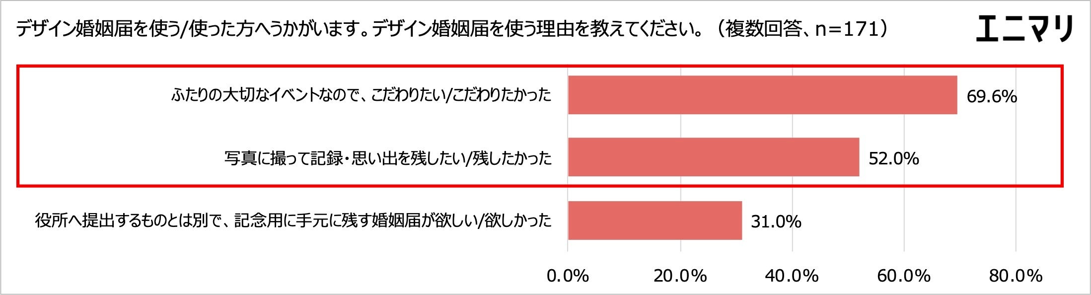 エニマリが運営するウェディング総合情報サイト『みんなのウェディング』において、挙式を終えた「卒花嫁」さんやこれから挙式を予定している「プレ花嫁」さんを対象に婚姻届に関するアンケートを実施したところ、「デザイン婚姻届」を「知っている」と回答した方が9割超となりました。「デザイン婚姻届」 を使う予定がある/使った方へ、使う理由についてたずねたところ「ふたりの大切なイベントなので、こだわりたい/こだわりたかった」との回答が69.6%で最多となり、次いで「写真に撮って記録・思い出を残したい/残したかった」が52.0%となりました。婚姻届の提出をイベントとして大切にしているからこそ、婚姻届のデザインでそれぞれのカップルらしさを表現したい、素敵な思い出にしたい、と考える方が多いことがうかがえます。一方、「保管用婚姻届」についてたずねたところ、「知っている」との回答は5割超となりました。婚姻届にこだわりたい、記念に残したいというニーズを受けて、今後は「保管用婚姻届」のさらなる認知やニーズの拡大が期待されます。