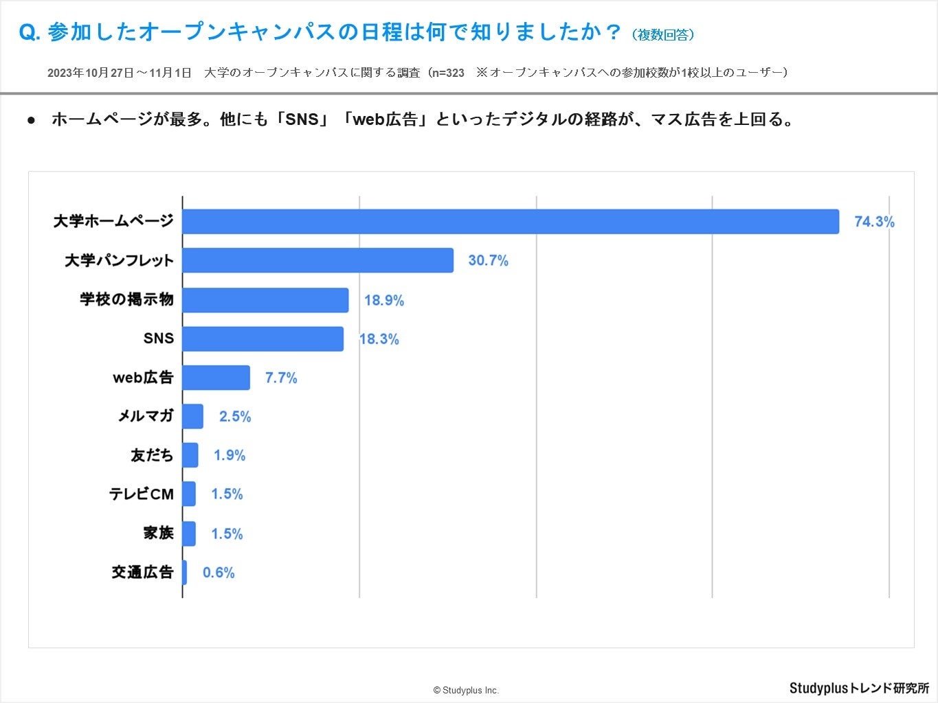 | ③ | オープンキャンパスの日程を知った経路は「大学ホームページ」が最多。SNSやweb広告のような"デジタル"の経路が、"マス広告"を上回る傾向も。 |