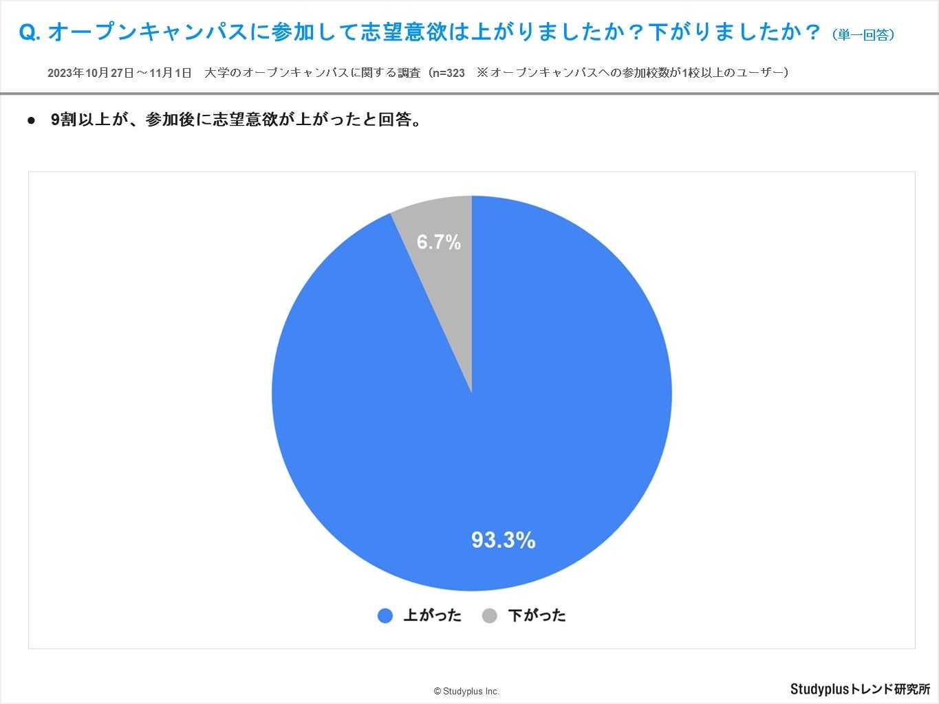 【調査項目⑩】オープンキャンパスに参加して志望意欲は上がりましたか?下がりましたか?(単一回答) ※オープンキャンパスの参加校数が1校以上のユーザー向け調査