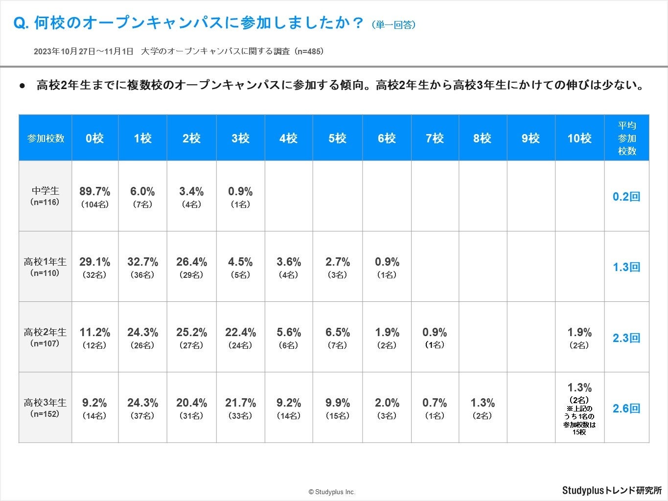 【回答①】高校2年生までに複数校のオープンキャンパスに参加する傾向。高校2年生から高校3年生にかけての伸びは少ない。