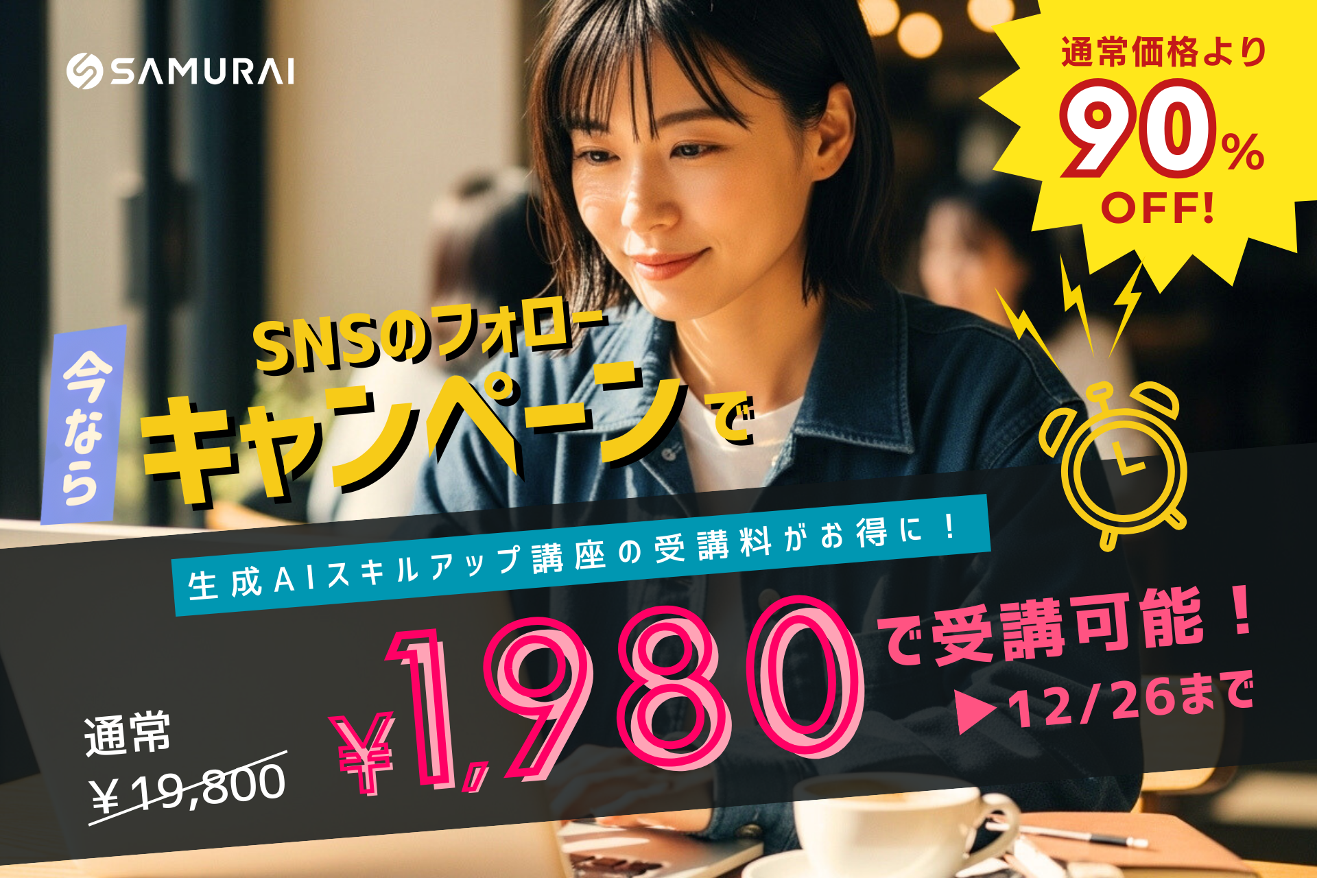 法人向けIT教育・研修事業を展開する株式会社SAMURAI(本社:東京都港区、代表取締役:羽田吾立)は、生成AIスキルの習得を目的とした公開講座において、年末企画としてSNSキャンペーンを実施しています。本キャンペーンでは、通常価格から最大90%割引となる1,980円(税込)で講座を受講できます。
