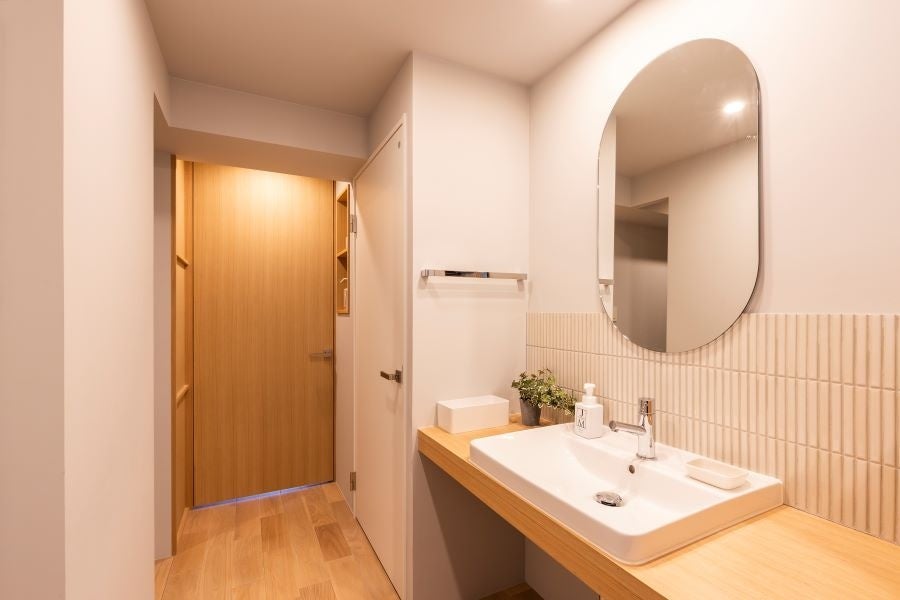 場所は旭橋駅から徒歩7分と利便性が良い人気のエリア。資産価値の落ちにくい立地や物件を選ぶことで、将来の売却や賃貸という選択肢も視野に入れた住まいです。もともと3LDKあった間取りを、DINKSやプレファミリーを想定し、可変性のある「1LDK+ウォークスルークローゼット」にリノベーション。56.7㎡というややコンパクトな専有面積を隅々まで有効活用し、家事の時短を叶える、機能的で快適な空間が完成しました。