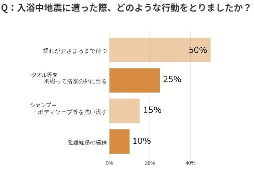 アンケート結果では「揺れがおさまるまで待つ」が半数の割合で、1位となりました。むやみに動かないという点では正しい判断なのですが、これよりもまず1番に行って頂きたいのは「避難経路の確保」です。大きな地震の場合建物が歪んでしまい扉が開かなくなってしまうということが考えられます。そのため、まずは浴室の扉を開放し、その後洗面器や風呂蓋で頭を覆い揺れがおさまるのを待ちましょう。