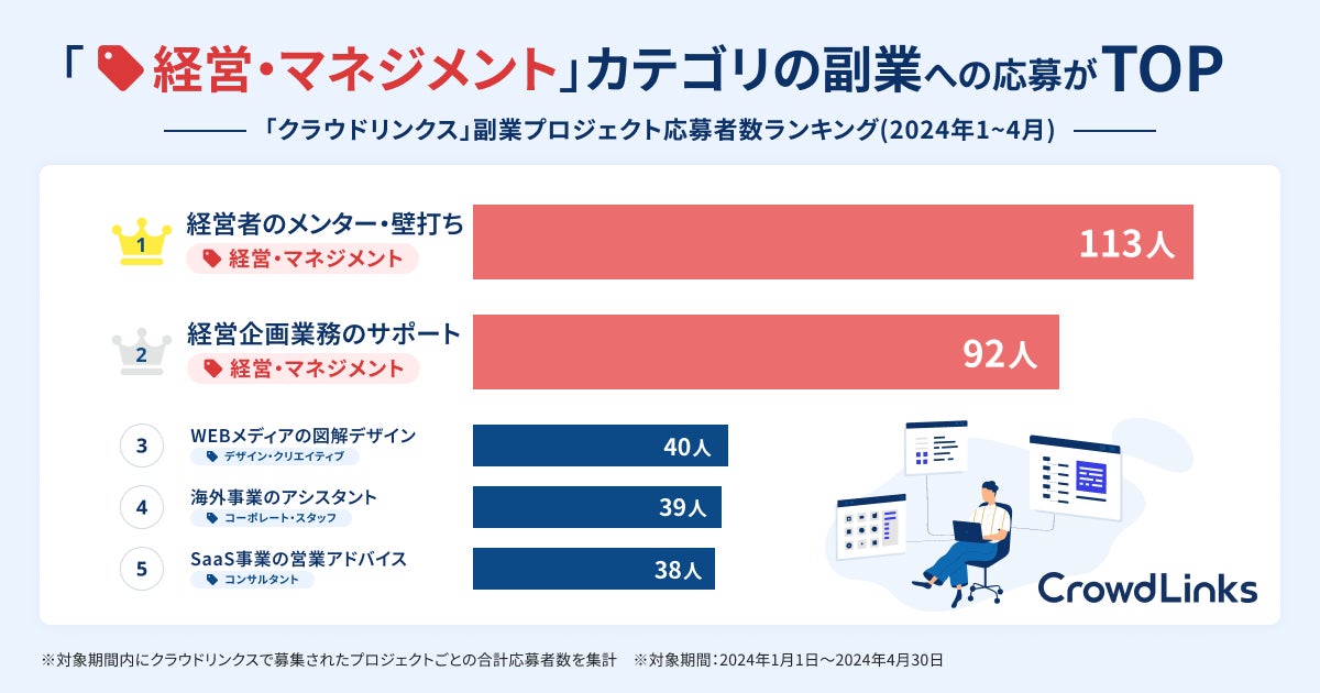クラウドリンクスで2024年1月から2024年4月末までに募集されたプロジェクトのうち、ワーカーからの応募数トップ1位と2位のプロジェクトは「経営・マネジメント」のカテゴリーでした。