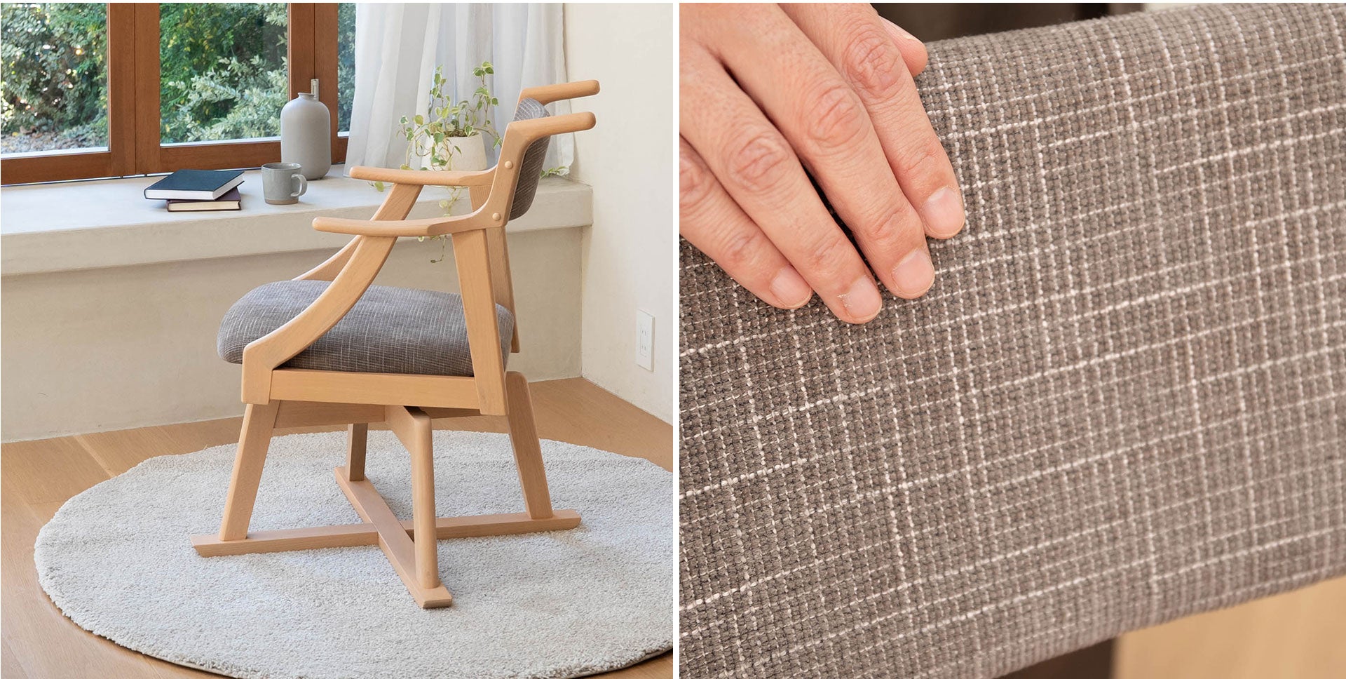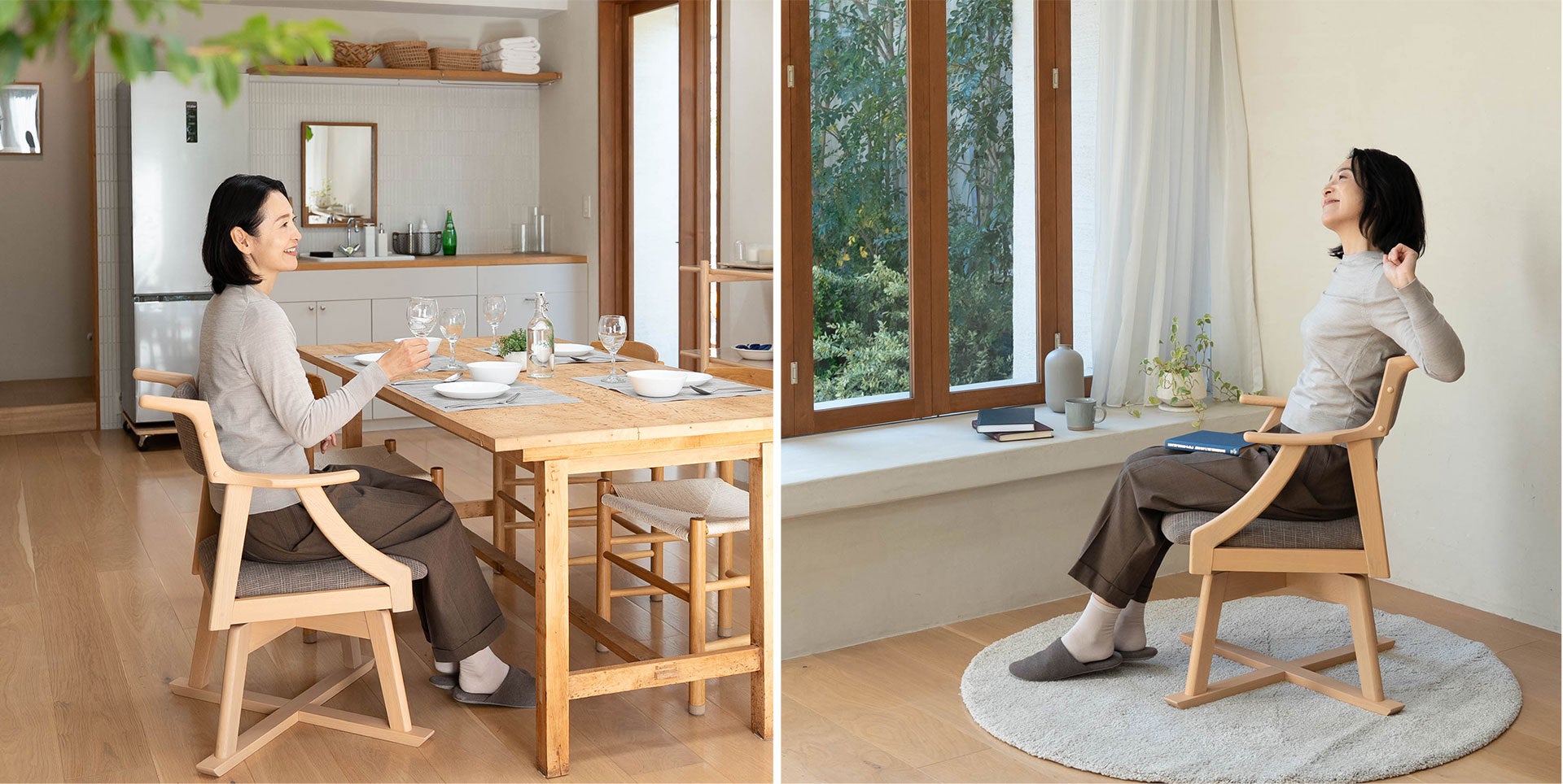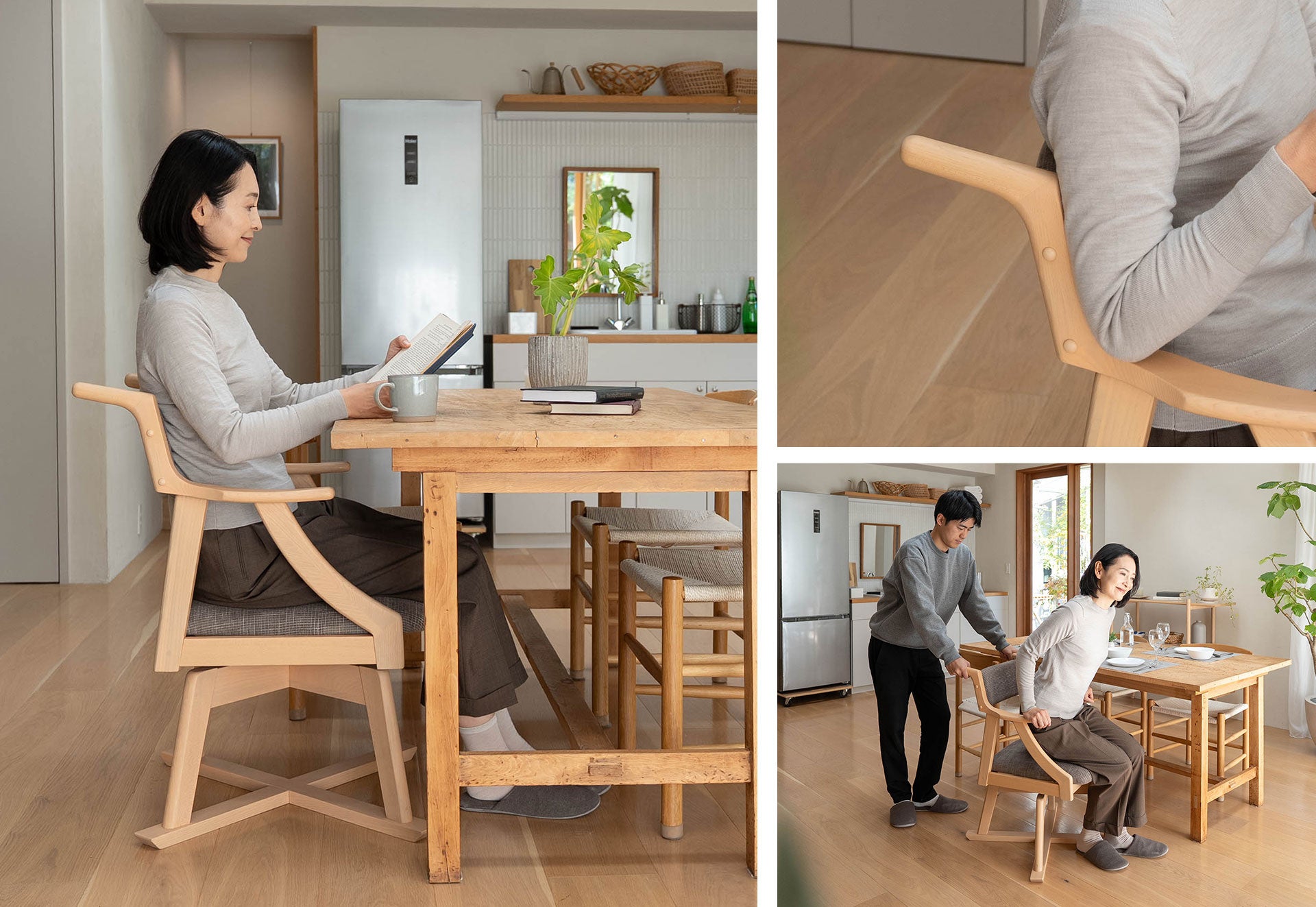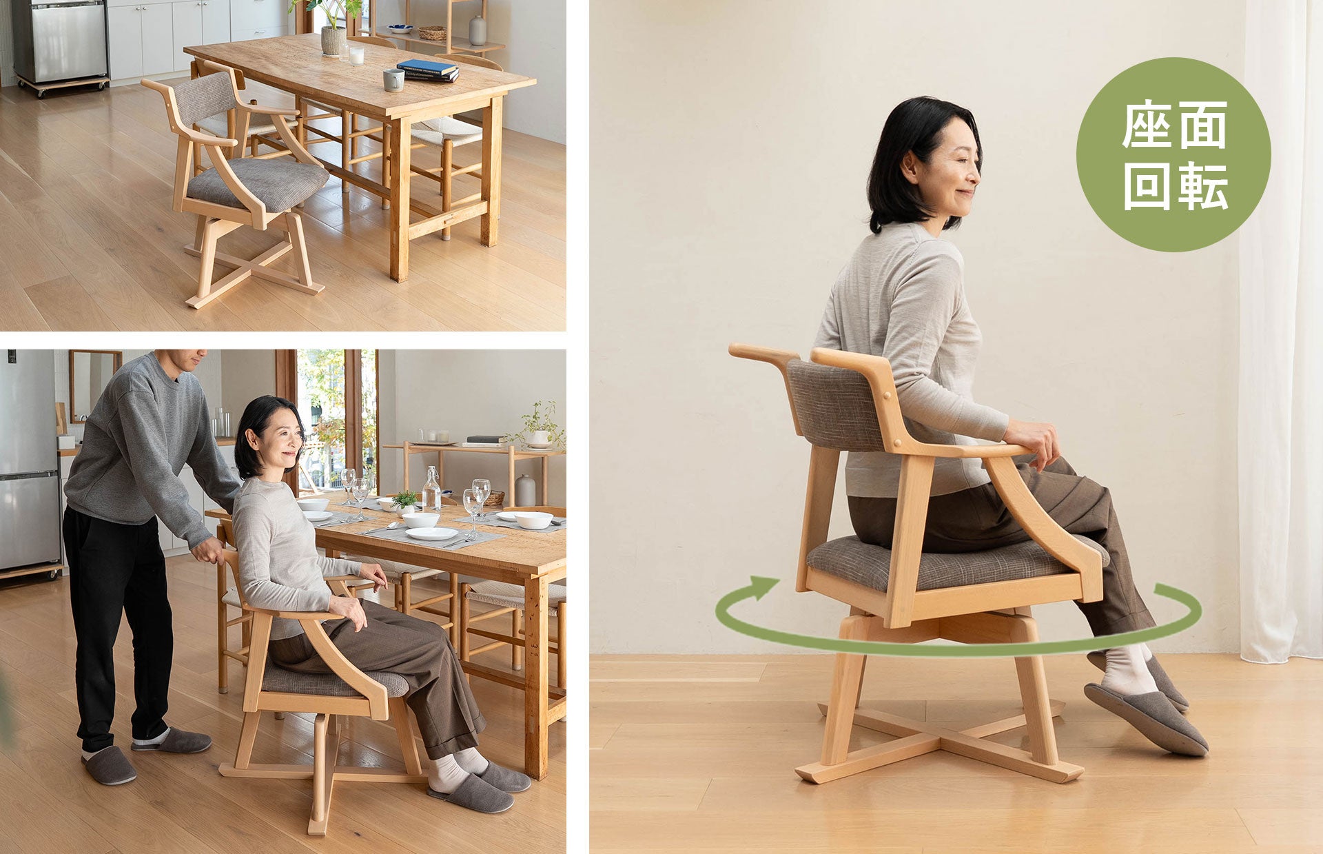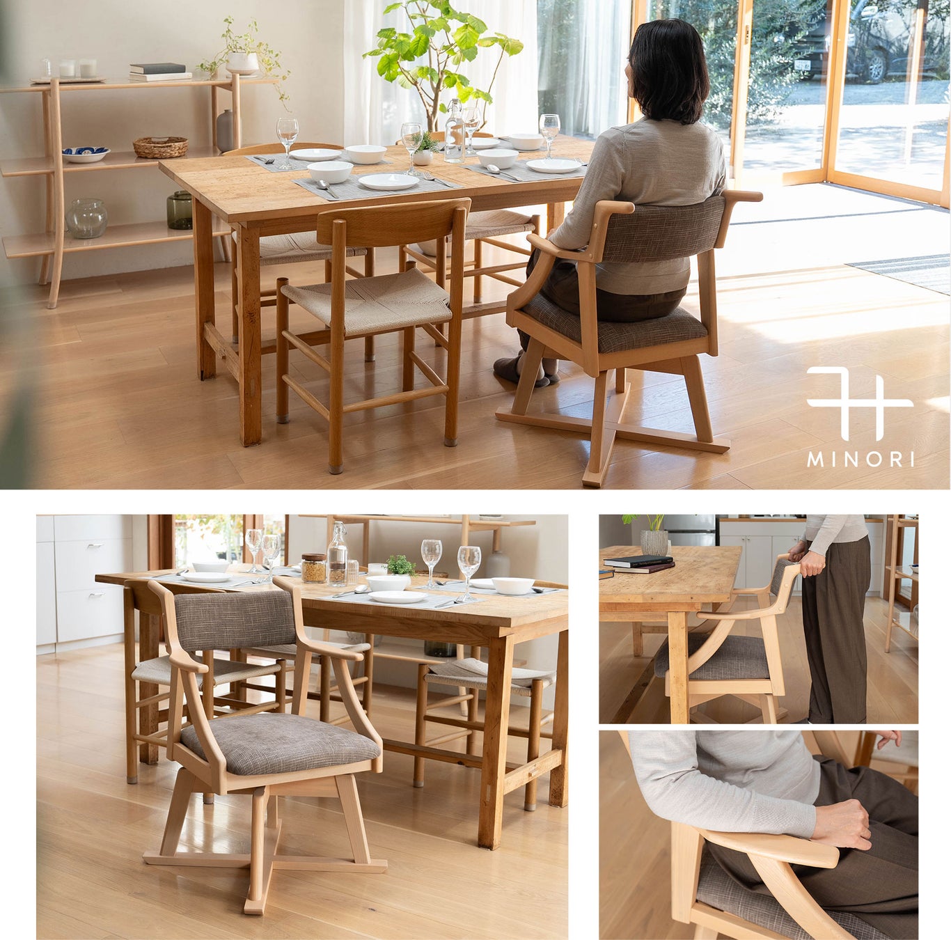 食べることも、くつろぐことも、無理なく続けられる。「食を楽しむための椅子【みのり】回転タイプ」は、毎日のダイニングチェアとしてはもちろん、ご高齢の方のサポート用や介護シーンにも活躍。常設しても生活感が出にくい、上質な佇まいの一脚です。